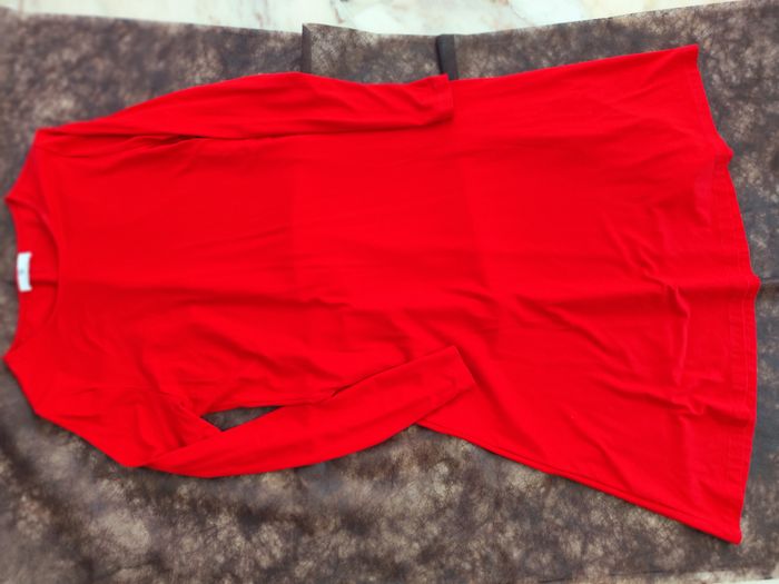 Elégante robe rouge vermillon en maille viscose PETER HANN. Forme ajustée au buste et évasée dans le base. Belle tenue et entretien facile.