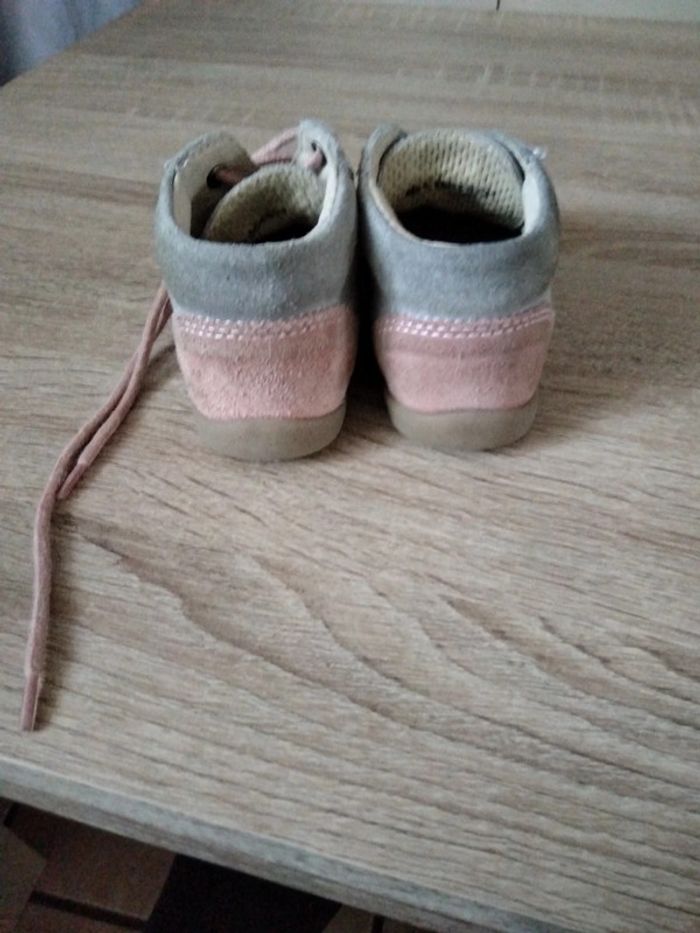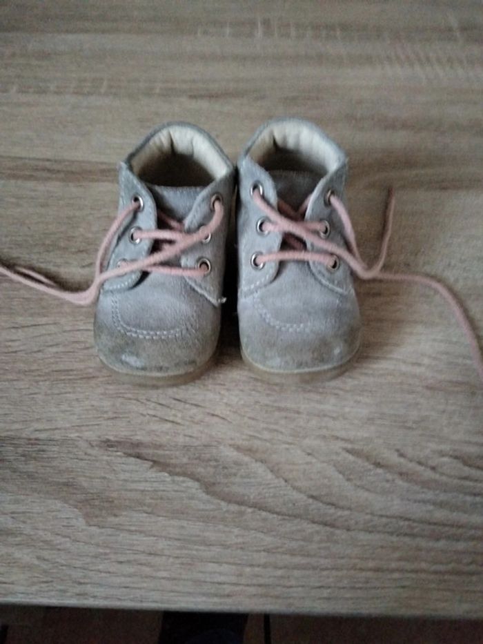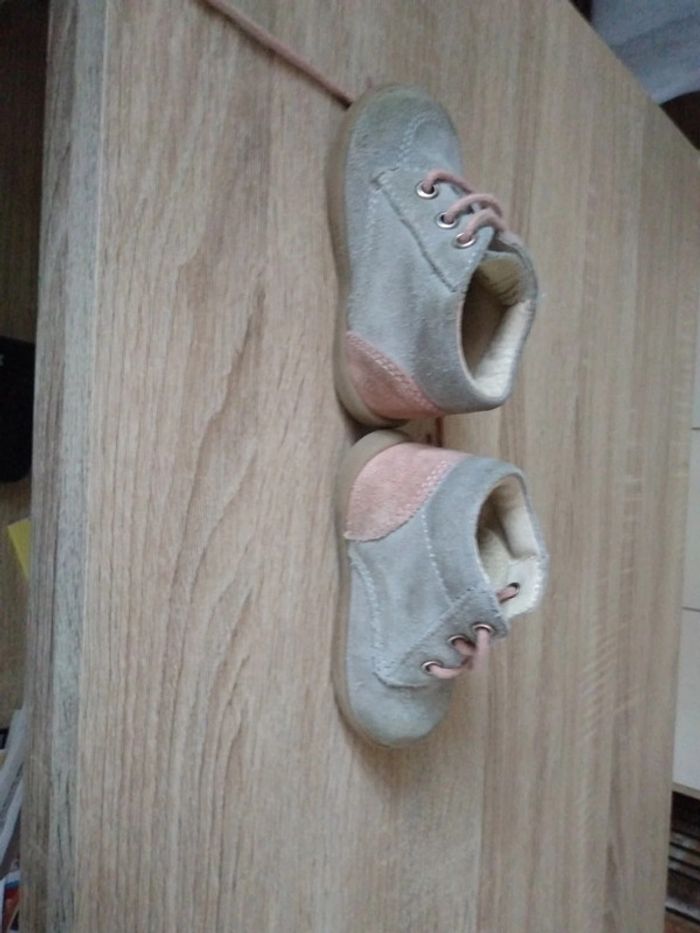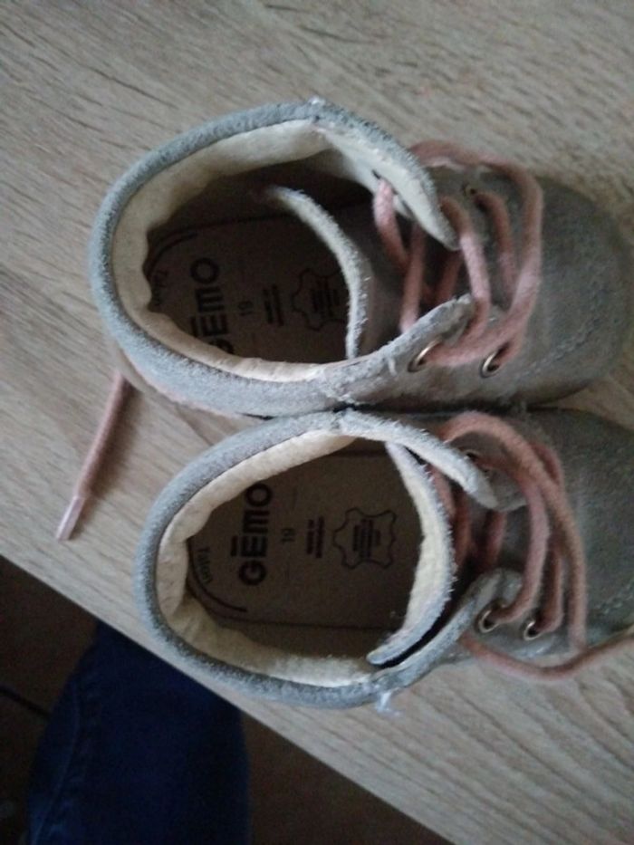Bottillons gris et rose taché sur le devant. Fermeture par lacets (non abîmés) uniquement. Taille 19 marque Gémo