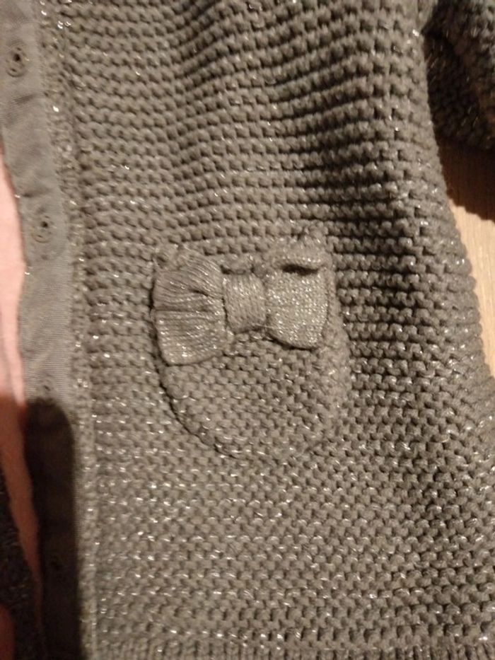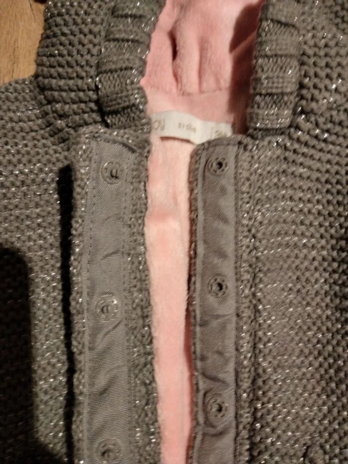 Gilet gris pailleté et rose taille 3 mois marque Gémo. Gilet tout doux et tout chaud à l'intérieur rose. Extérieur maille grise pailleté. Fermeture par pressions plastiques.
