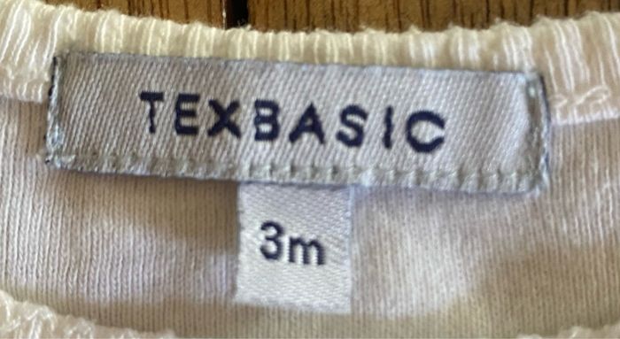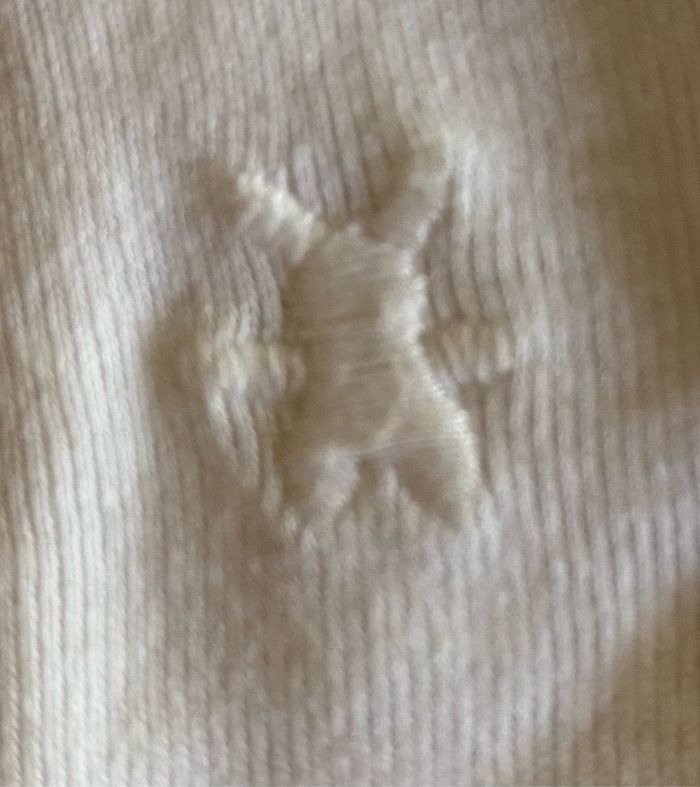 T-shirt sans taches. Petit dessin sur le côté gauche qui ressemble à un petit lapin. Deux petites pressions sur l’épaule gauche..