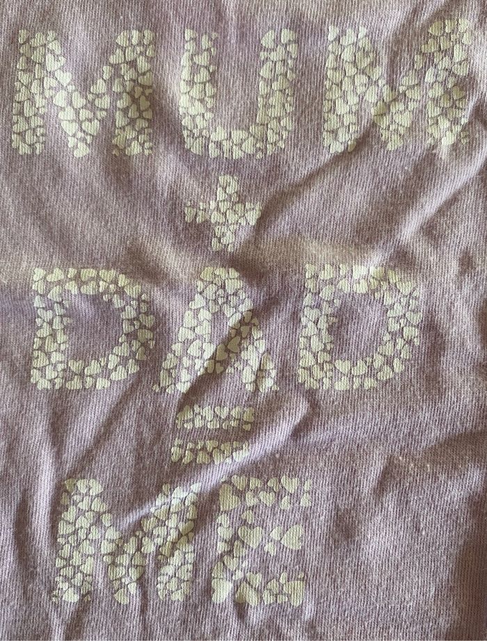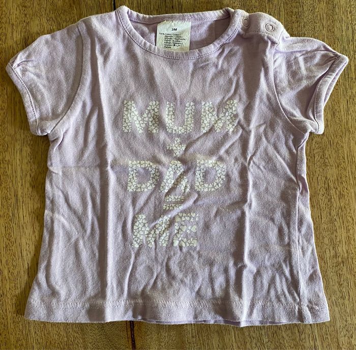 Petit message écrit sur le T-shirt, avec plein de petits cœurs, ils forment les lettres. MUM + DAD = ME Sans tache. Deux Petits pressions sur l'épaule gauche.