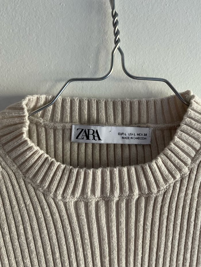 Haut beige Zara à longue manche. Taille assez court, il est en excellent etat. Taille L mais taille bien plus petit, plutôt S ou M et taille plutôt cintrée