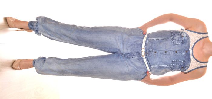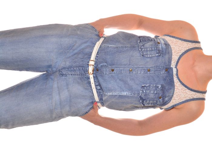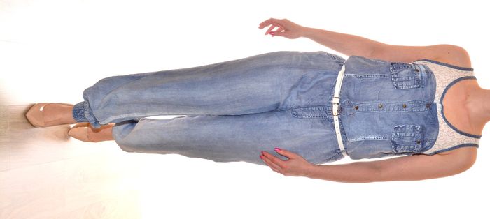combinaison pantalon sans manches blanc dentelle et bleu jean clair T42/44