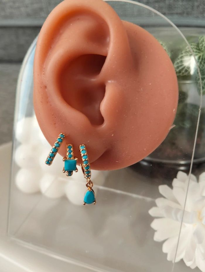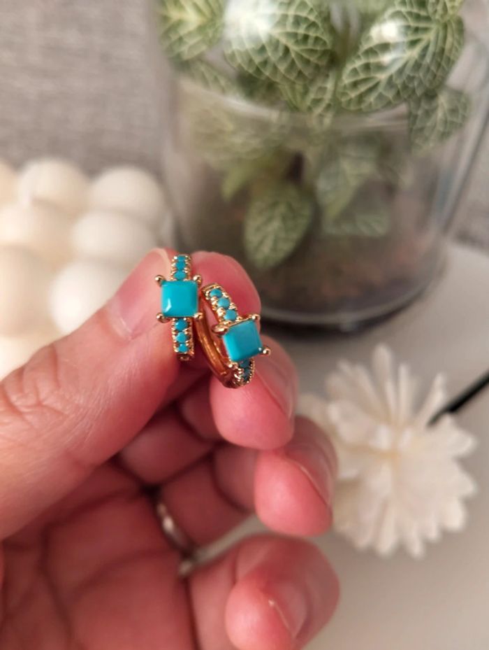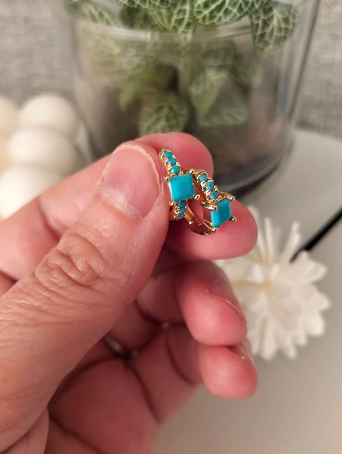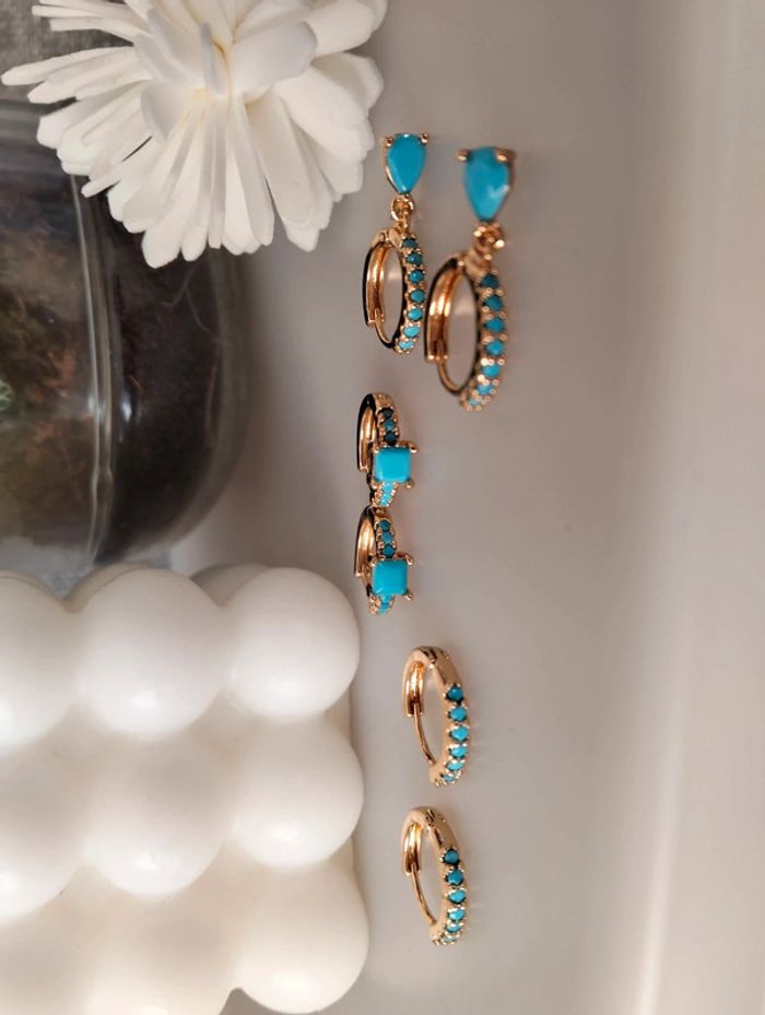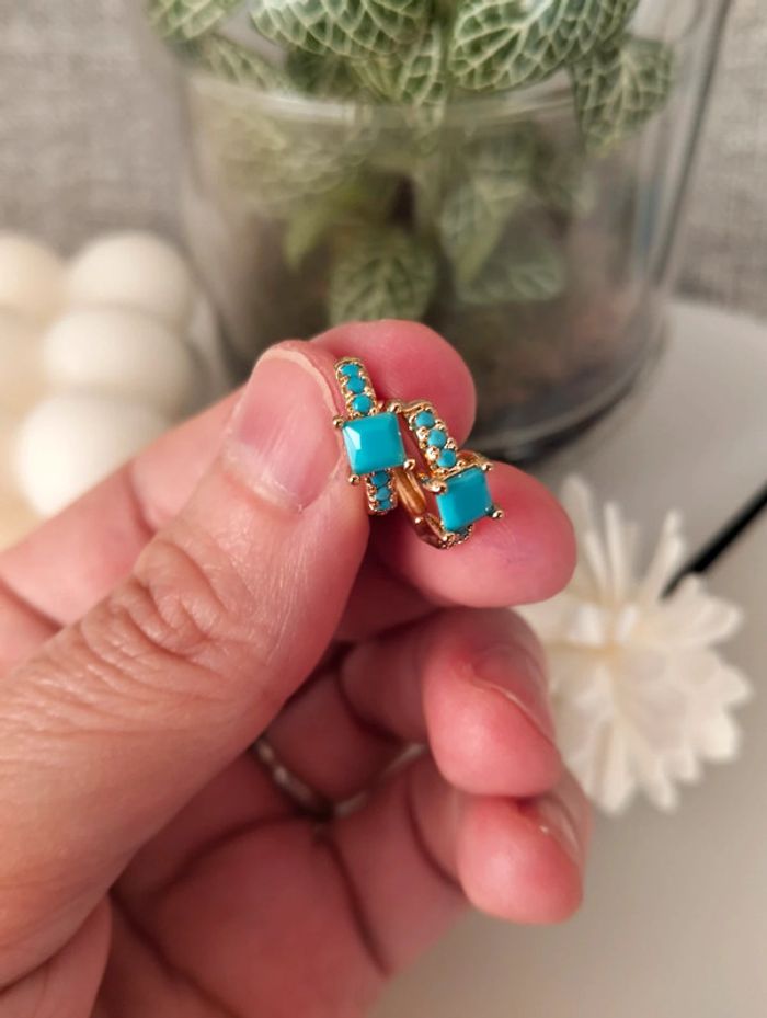 Composition mini créoles (6 unités) en acier inoxydable turquoise et doré. Mini créole pampille + carré + strass Mes bijoux : #neidj2001bijoux Mes accessoires : #neidj2001accessoires
