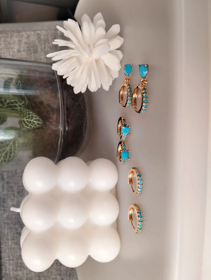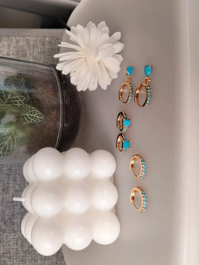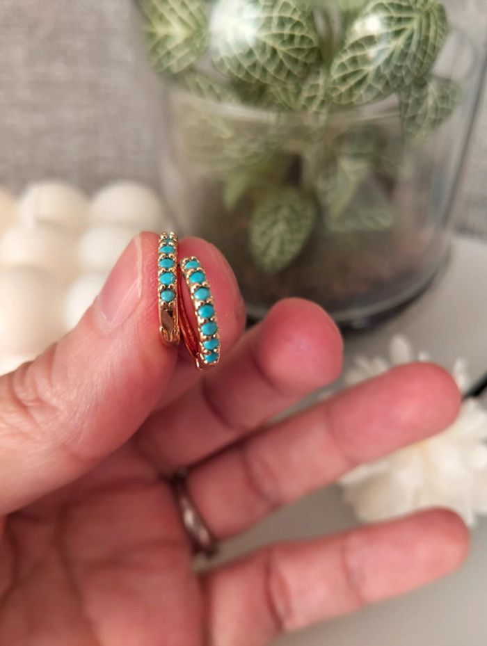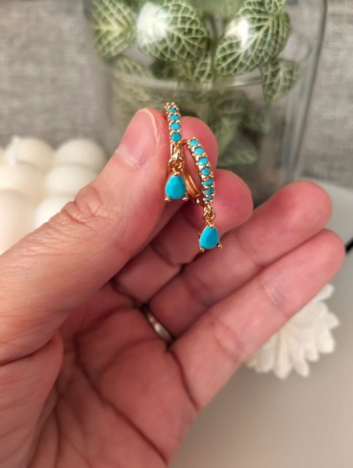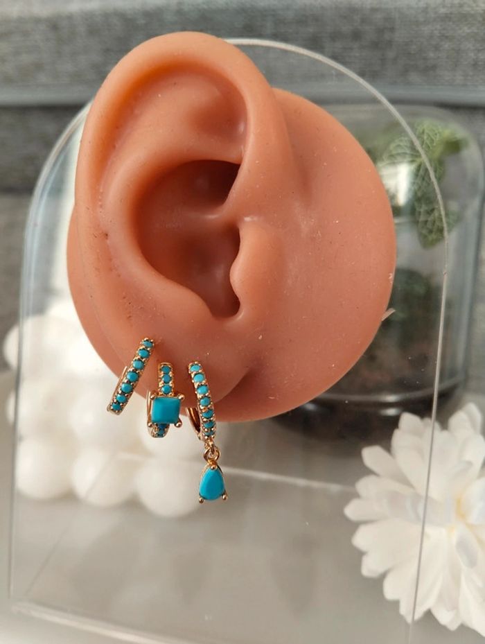 Composition mini créoles (6 unités) en acier inoxydable turquoise et doré. Mini créole pampille + carré + strass Mes bijoux : #neidj2001bijoux Mes accessoires : #neidj2001accessoires
