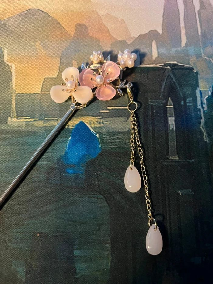 Bâton à chignon argentée fleure blanche et rose - photo numéro 3