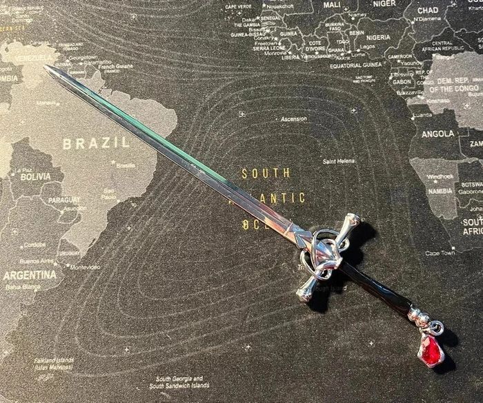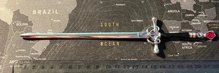 Barette à cheveux épée argentée - 13 cm pic chignon (19cm total) - lame argentée, poigne noir, rouge - métal - neuf, j'amais porté