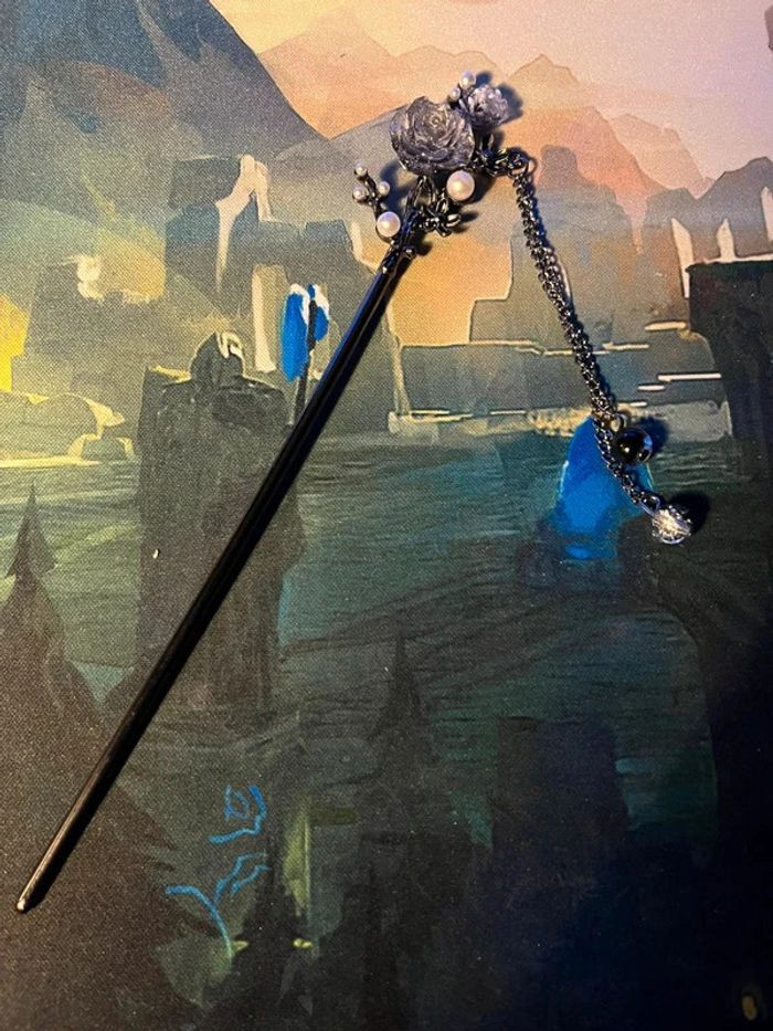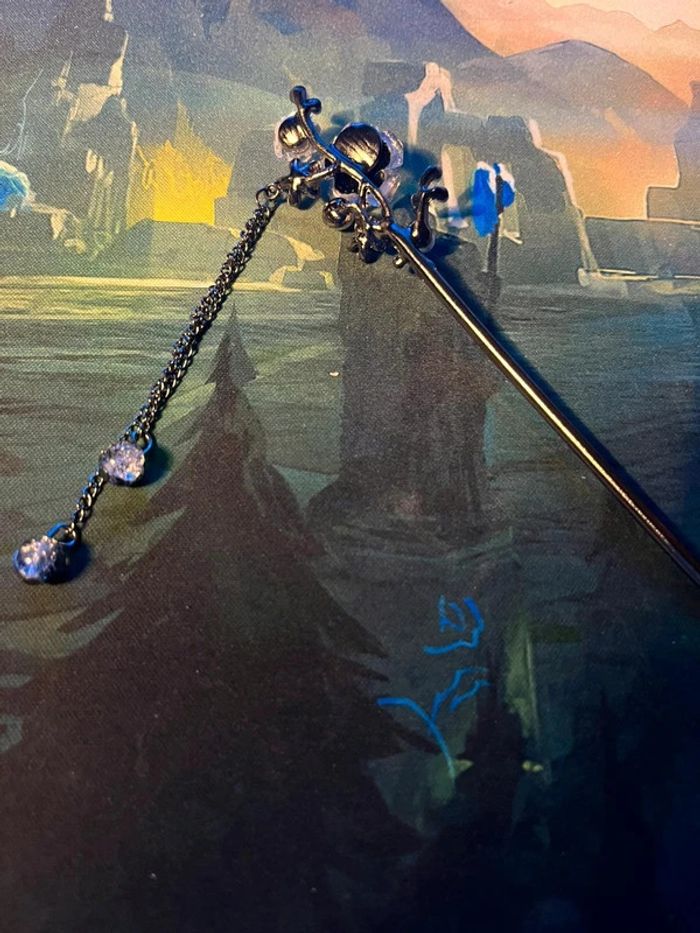 Bâton à chignon métallique noir perlée - métal - sombre et fleur blanche enneigée - style florale enneigée - neuf - 19cm
