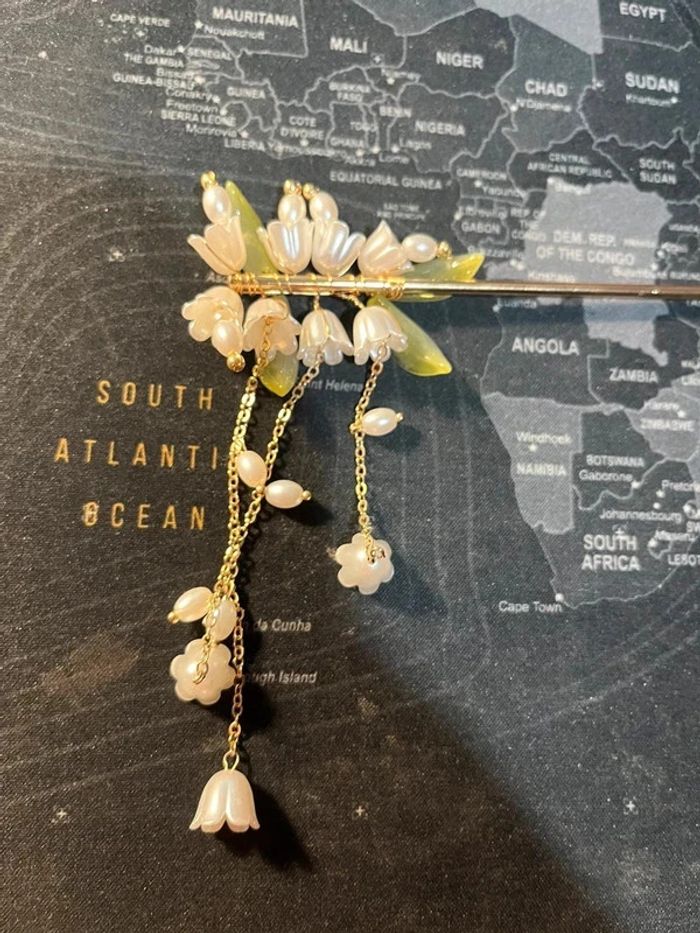 Baton a chignon muguet perlée - neuf jamais porté - métal & feuille plastique - 16cm - dorée, vert, blanc