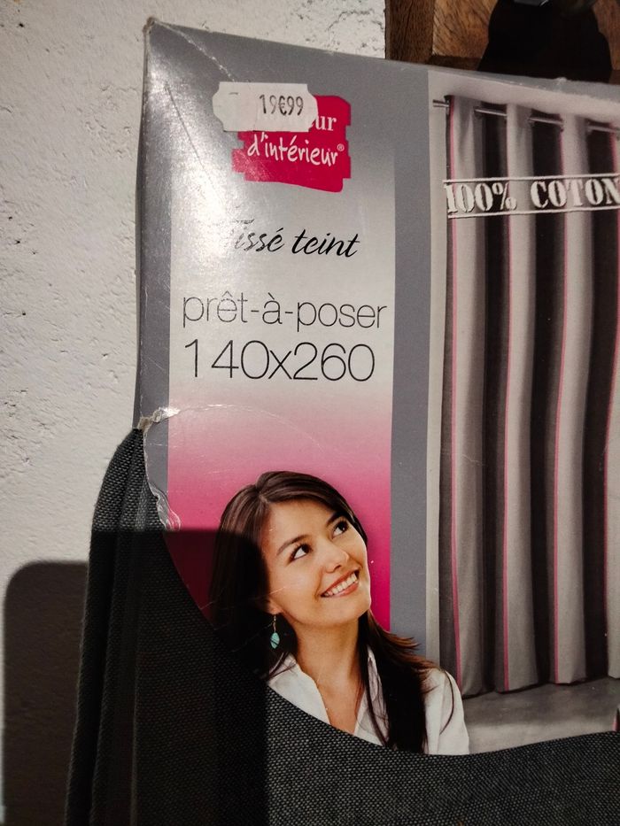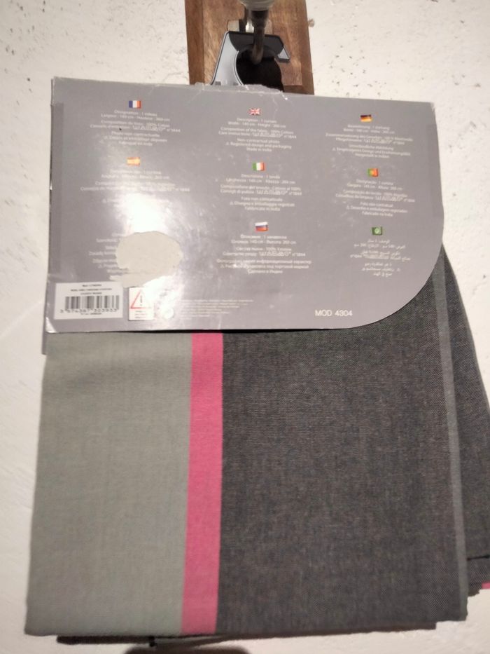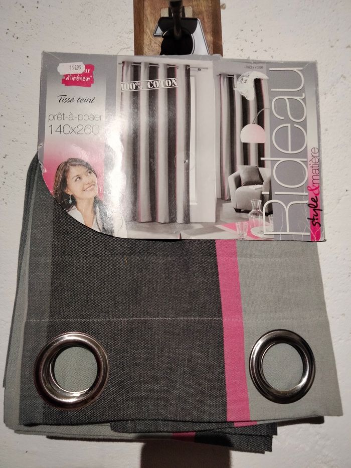 Rideau tissé teint gris et rose. Avec oeillets. Mesure 140x260 cm. Composition : 100% coton Neuf