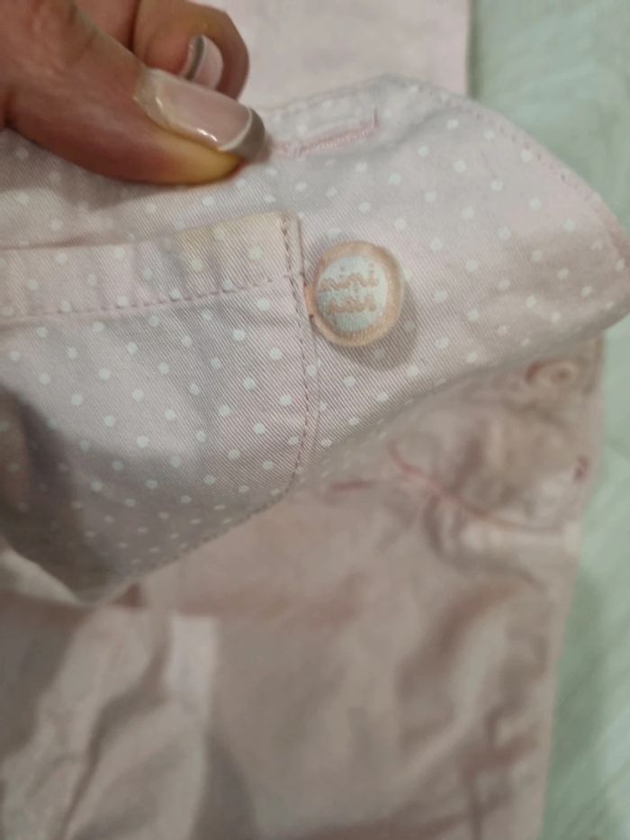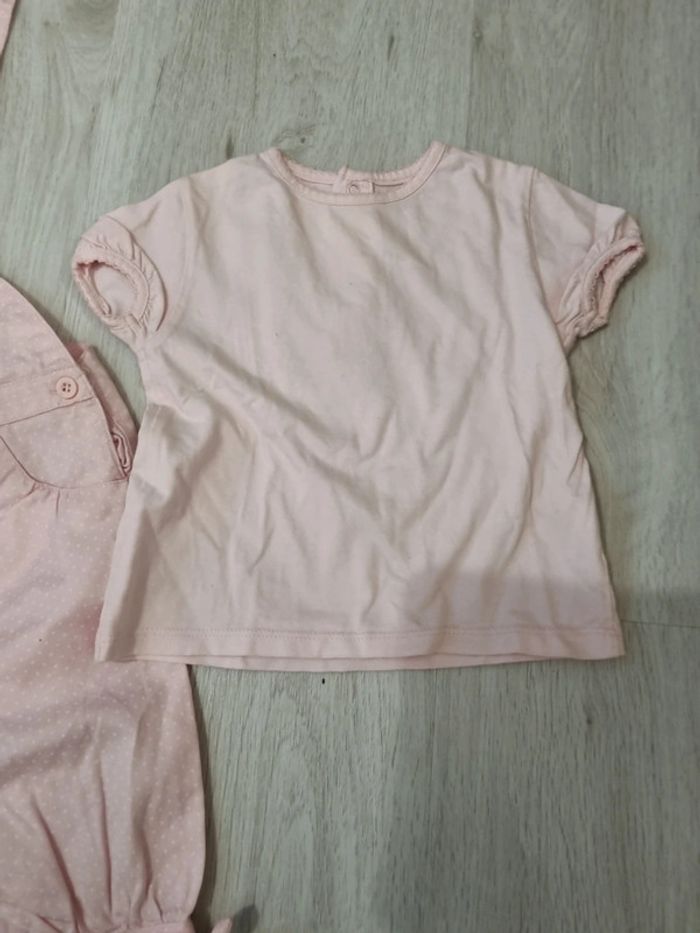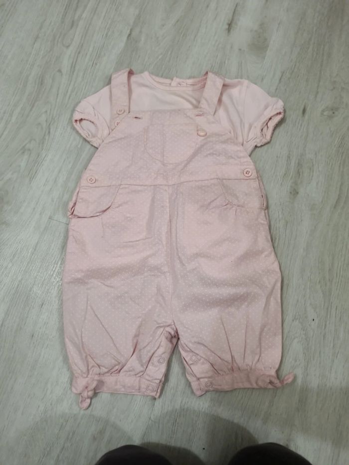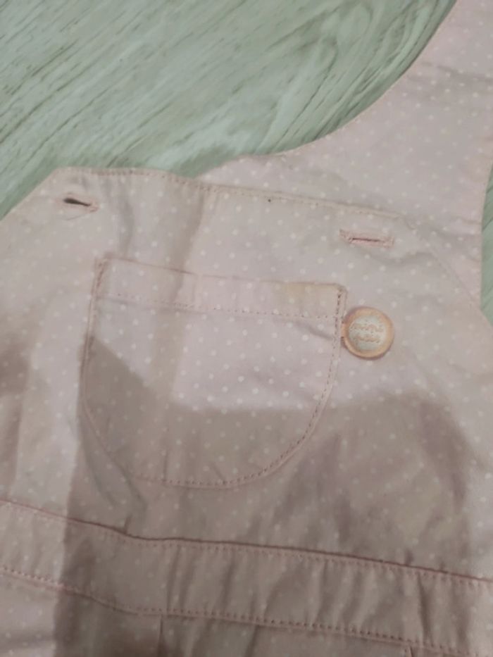 Salopette tout coton rose clair à pois blancs, mini pois et Tee-shirt manches courtes rose, 12 mois. Petite tâche devant #somara66fille12mois