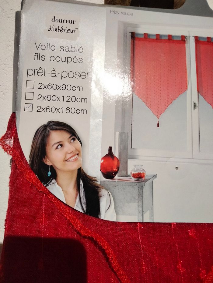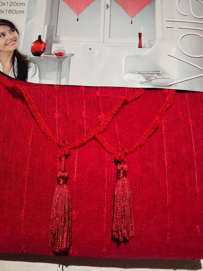 Paire de voilage rouge avec pompon. Mesure 60x160. Composition : 100% polyester. Neuf
