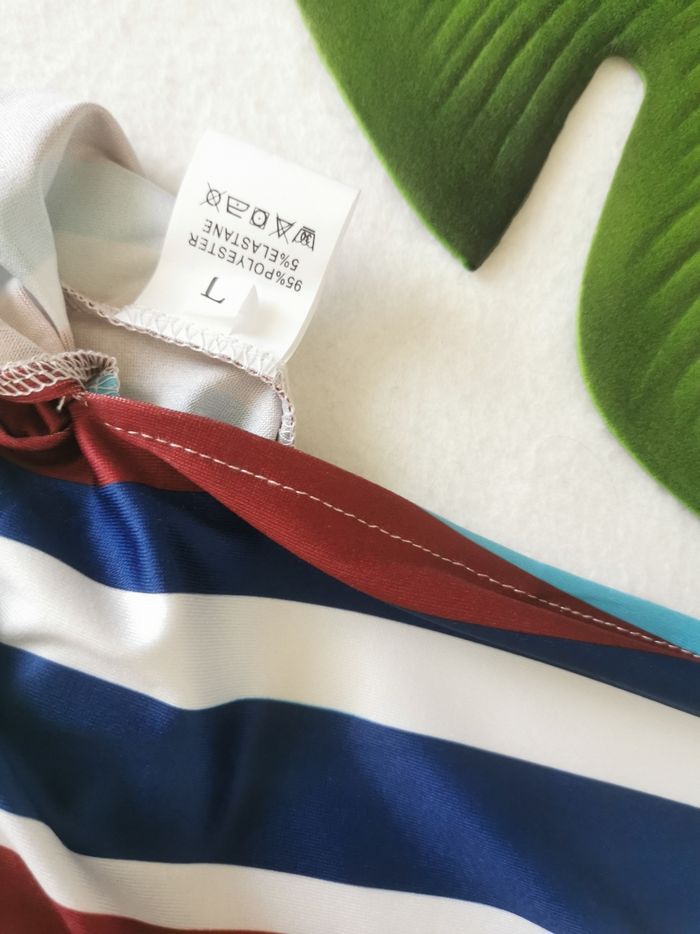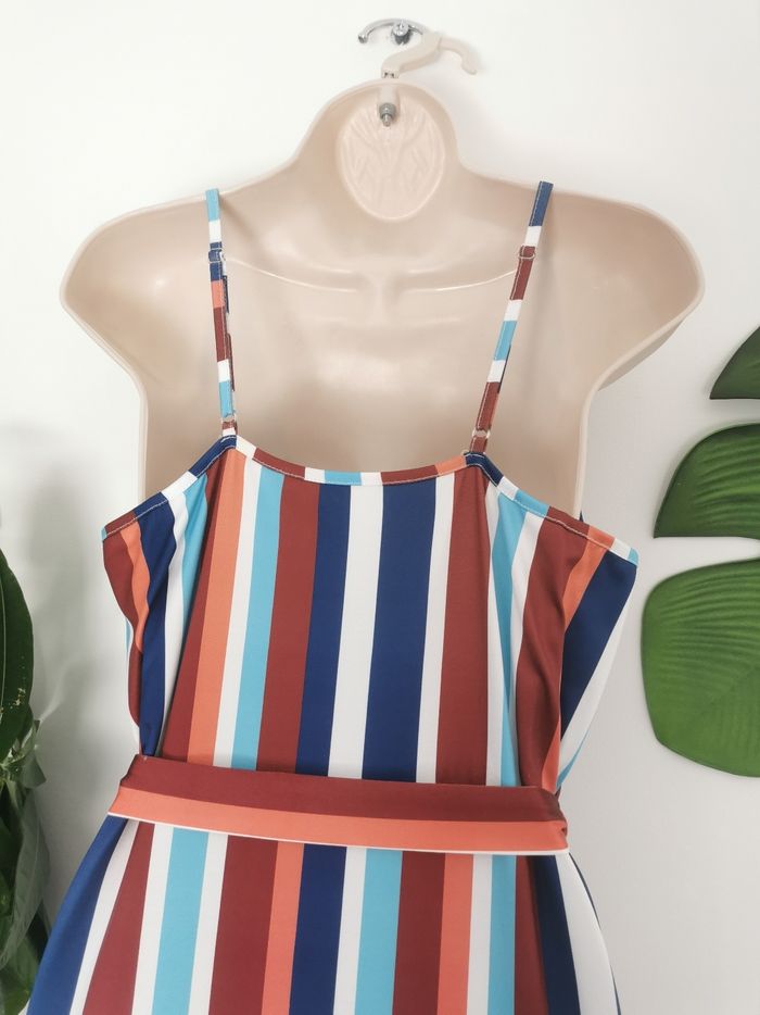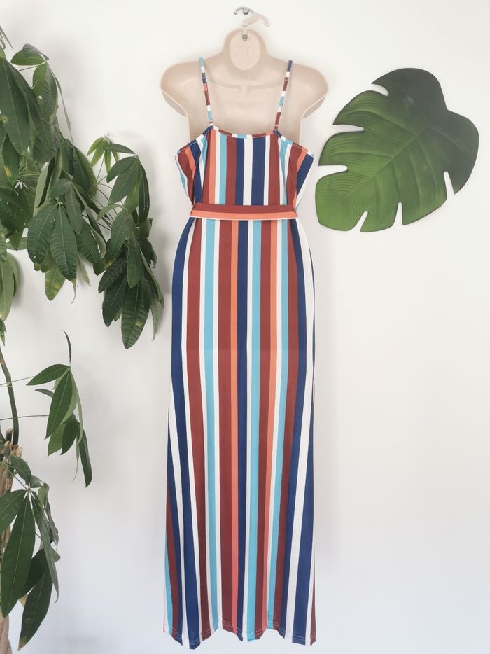 👗 ÉTAT DE L'ARTICLE: 10/10 ✅️ Sans étiquette, jamais portée 📷 Photos portées du site disponibles en message privé 📷 Robe 👗 longue fendue 🙎‍♀️ Taille L • Tissu léger, fin et stretch • Décolleté en V • Fines bretelles réglables • Taille ajustable avec ceinture à nouer 🎀 sous Passants h • Fendue de chaque côté sur 📏62 cm • Rayures verticales multicolores 🔵⚪🟤🟠 • 📏 Longueur: 140 cm • 📏 Mesure sous aisselles: 49 cm Parfait état👌, jamais portée 🔵🔵