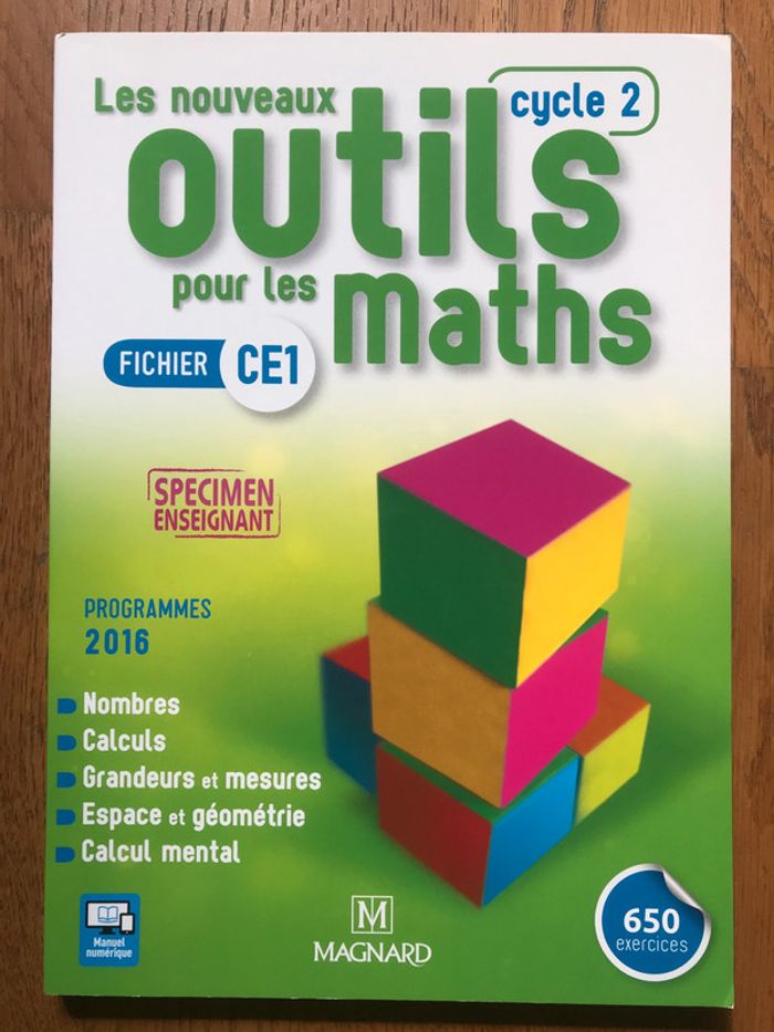 État neuf 160 pages Format 21 x 29.7 cm Fichier de l’élève CE1 (vierge) La traduction pertinente des nouveaux programmes de cycle dans notre collection reconnue pour son efficacité. Un fichier organisé par domaines : - nombres - calculs - espace et géométrie - grandeurs et mesures - calcul mental Une démarche claire et récurrente avec, pour chaque leçon : - une activité de découverte collective, - les règles et méthodes indispensables pour l'élève, - de très nombreux exercices et problèmes progressifs pour s'entraîner. Des pages : - Je révise, - Je résous des problèmes, - J'utilise les maths dans d'autres disciplines. Des pages « Vers le CE2 » pour une construction des compétences au fil du cycle. Des activités numériques sur le site ressources pour répondre aux compétences attendues des nouveaux programmes. Une proposition de programmation sur l'année. Proposé à 9,80 € - négociable #CE1domi8084