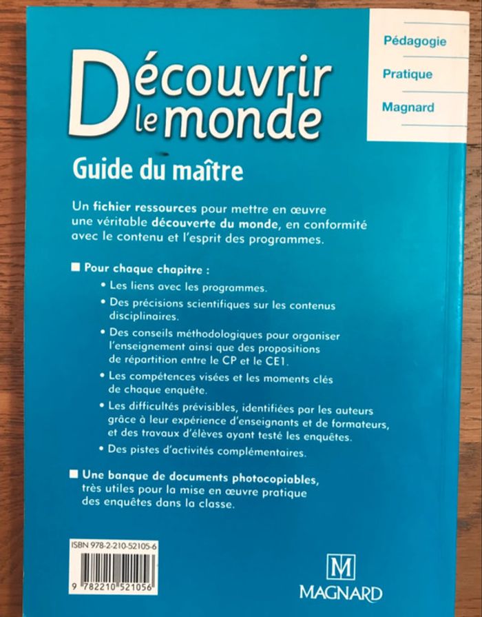 Parfait état 255 pages Format 19 x 1.4 x 27 cm Guide pédagogique CP - CE1 Indispensable pour bien préparer les séances ! Un fichier ressources pour mettre en œuvre une véritable découverte du monde, en conformité avec le contenu et l'esprit des programmes. Pour chaque chapitre, vus trouverez des liens avec les programmes, des précisions scientifiques sur les contenus disciplinaires, des conseils méthodologiques pour organiser l'enseignement ainsi que des propositions de répartition entre le CP et le CE1. Il vous indique également les compétences visées et les moments clés de chaque enquête, les difficultés prévisibles, identifiées par les auteurs grâce à leur expérience d'enseignants et de formateurs, et des travaux d'élèves ayant testé les enquêtes, et des pistes d'activités complémentaires. Il vous offre également une banque de documents photocopiables, très utile pour la mise en œuvre pratique des enquêtes dans la classe. Proposé à 14,50 € - négociable #pédagogiedomi8084