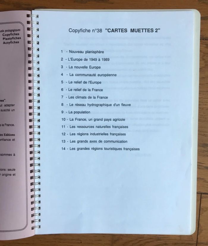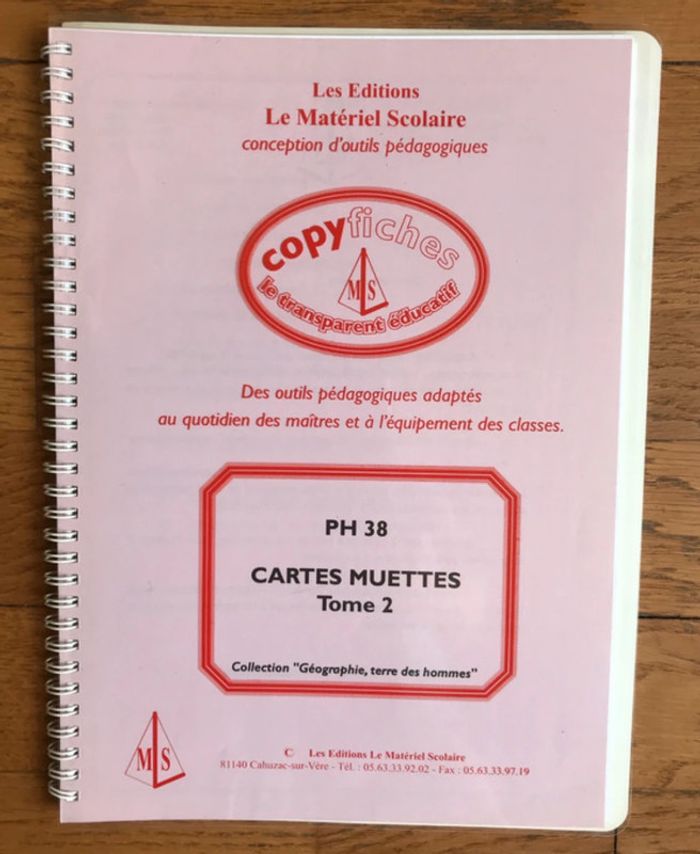 État neuf Format 21 x 29,7 cm Géographie Cartes muettes cycle 3 Fiches pour photocopieurs et vidéoprojecteurs. Suggestions de travail pour chaque fiche. Les copyfiches constituent un outil pratique pour des exercices d’application, de révisions, de contrôle ou d’évaluation. Chaque fiche est imprimée sur un transparent : avec un stylo feutre effaçable, l’enseignant peut écrire ses propres consignes ou ajouter d’autres informations. Les copyfiches sont présentées en cahier à spirale, ce qui permet une ouverture totale. Elles sont réutilisables indéfiniment avec une qualité de reproduction constante, > Voir sommaire en photo. Proposé à 15,80 € - négociable #pedagogiedomi8084