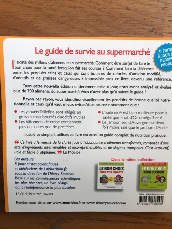 État neuf 320 pages Format 15.7 x 1.2 x 15.7 cm Il existe des milliers d'aliments en supermarché. Comment être sûr(e) de faire le bon choix pour la santé lorsqu'on fait ses courses ? Comment faire la différence entre les produits sains et ceux qui sont bourrés de calories, d'amidon modifié, d'additifs et de graisses dangereuses ? Impossible sans ce livre, devenu une référence. Proposé à 9,80 € - négociable
