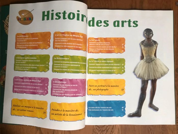 Livre comme neuf 63 pages Format 23 x 28.5 cm Livre de l’élève CE2 - CM1 - CM2 Un dossier pour rendre l’histoire des arts vivante : > Des chapitres centrés sur chaque grande période historique du programme. > Une approche dynamique qui favorise l’observation de documents et le débat. > Une construction progressive du savoir à travers un questionnement sur des documents variés. - Chacun des 8 chapitres tient compte à la fois des périodes historiques et des différents domaines artistiques. Puisque l’enseignement de l’histoire des arts est fondé sur l’étude des œuvres, cette étude est conduite dans tous les chapitres à partir d’un ensemble d’œuvres défini par des critères communs (lieu, genre, auteur, mouvement …). - Les œuvres sont analysées à partir de quatre critères au moins : forme, technique, signification, usage. Ces analyses permettent aux élèves de manier un premier vocabulaire technique et sensible, de maitriser des repères essentiels dans le temps et l’espace et de découvrir le plaisir que procure la rencontre avec l’art. - Trois doubles pages transversales "À la manière de..." permettent aux élèves de découvrir l’histoire des arts de manière active (dessiner en respectant les règles de la perspective, par exemple). Proposé à 6,50 € - négociable #Cycle3domi8084 #CE2domi8084 #CM1domi8084 #CM2domi8084 3