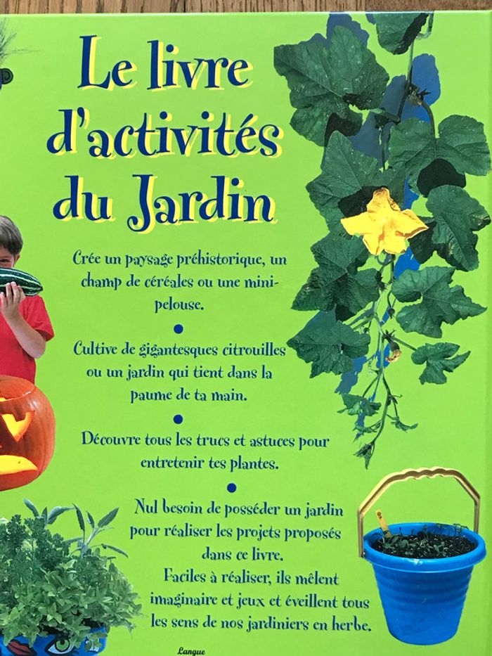 Livre comme neuf 48 pages Format 22 x 28 cm - Crée un paysage préhistorique, un champ de céréales ou une mini-pelouse. - Cultive de gigantesques citrouilles ou un jardin qui tient dans la paume de ta main. - Découvre tous les trucs et astuces pour entretenir tes plantes. Nul besoin de posséder un jardin pour réaliser les projets proposés dans ce livre. Faciles à réaliser, ils mêlent l’imaginaire et jeux et éveillent tous les sens de nos jardiniers en herbe. Proposé à 9,80 € - négociable #loisirsdomi8084