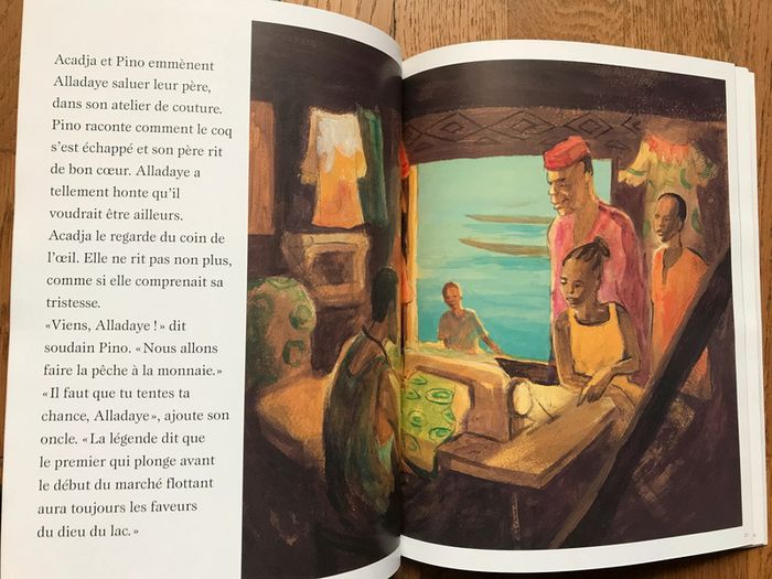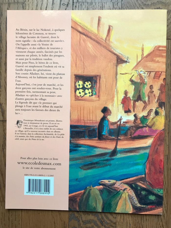 Livre neuf 46 pages Format 22 x 28 cm A partir de 7 ans Au Bénin, sur le lac Nokoué, à quelques kilomètres de Cotonou, se trouve le village lacustre de Ganvié, dont le nom signifie : « la collectivité est sauvée ». On l’appelle aussi « la Venise de l’Afrique », et des milliers de touristes y viennent chaque année, fascinés par les maisons sur pilotis, le ballet des pirogues, et aussi la tradition vaudou. Mais pour Pino, le héros de ce livre, Ganvié est simplement l’endroit où vit sa famille depuis des générations. Son cousin Allagaye, lui, vient du plateau d’Abomey, où les habitants ont peur de l’eau. Aujourd’hui, c’est jour de marché, et les deux garçons ont rendez-vous. Pour la première fois, surmontant sa peur, Allabaye va «pêcher à la monnaie» avec d’autres garçons du village. La légende dit que « le premier qui plonge à l’eau avant le début du marché aura toujours la faveur des dieux du lac »… Proposé à 6,80 € - négociable #bibliodomi8084