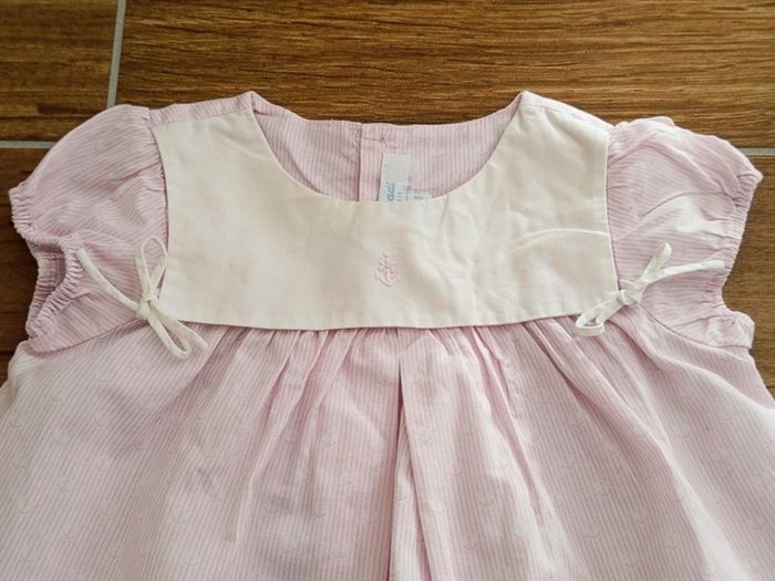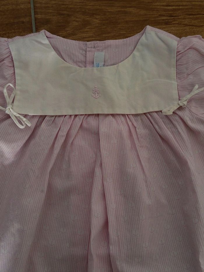 Petite robe rétro rose à rayures et imprimée ancre. Grand col blanc avec petit ruban . Boutonnière dos Marque Jacadi, 12 mois Idéal pour un look vintage, shabby Très bon état