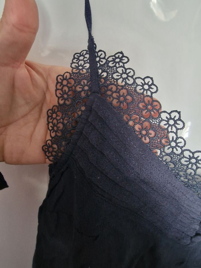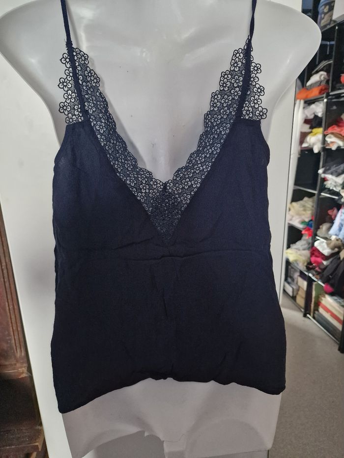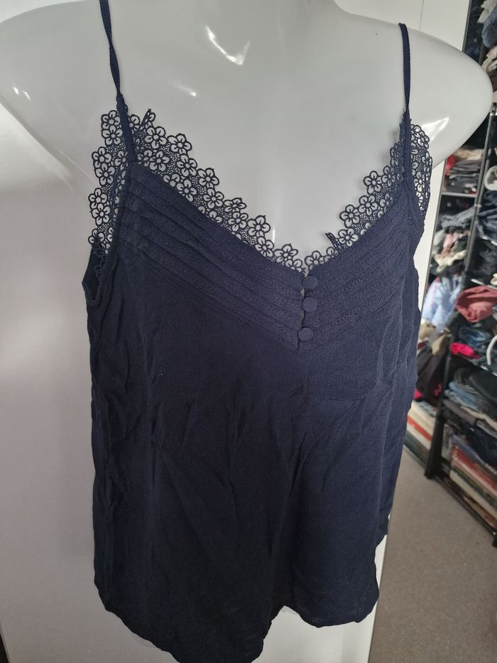 Il sort vraiement de l'ordinaire ! Regardez ce magnifique top bretelles spaghetti, en double voile aux superbes détails de dentelles fines tout le long de l'encolure, ainsi que ses 3 mini boutons donnant un style bustier très féminin. Et c'est sans regarder le magnifique dos forme V en dentelle lui aussi. Un magnifique top de création NafNaf. Mesure aisselles 40cms à plat et jusque 45cms en tirant (tissu extensible) Hauteur 52cms L'étiquette interieure est coupée et effilochée Je n'ai pas remarqué d'autre anomalie