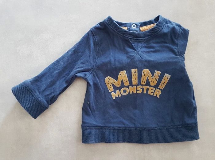 T-shirt manches longues, de couleur marine avec inscription marron "Mini Monster", de la marque Kiabi, taille 1 mois (52-55 cm), en très bon état. Article lavé pour la vente. #1moislae72