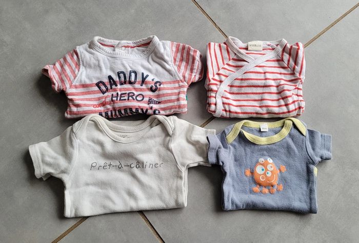 Lot de 4 bodys, 3 manches courtes (1 Baby Clib, 1 Gémo et 1 sans marque) et 1 manches longues (1 sans marque), taille 1 mois, en très bon état. Articles lavés pour la vente.