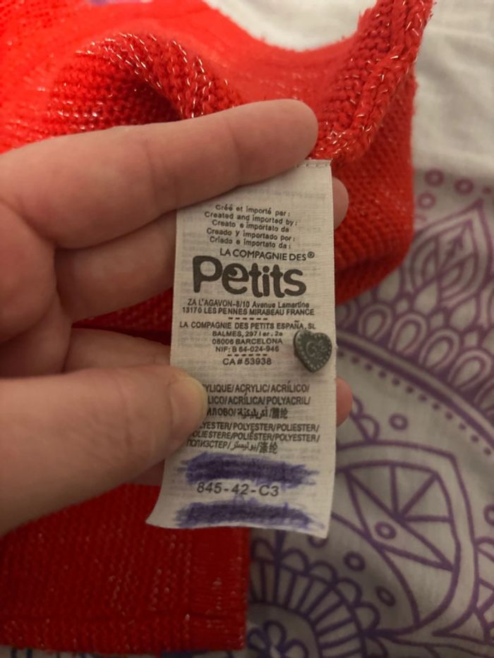Malgré la couleur des photos il est rouge, les petits boutons sont en forme de cœur, sur l’étiquette vous en avez un de rechange et les gribouillis 😅 désolé c’est parce qu’il y avait le nom de ma fille pour l’école