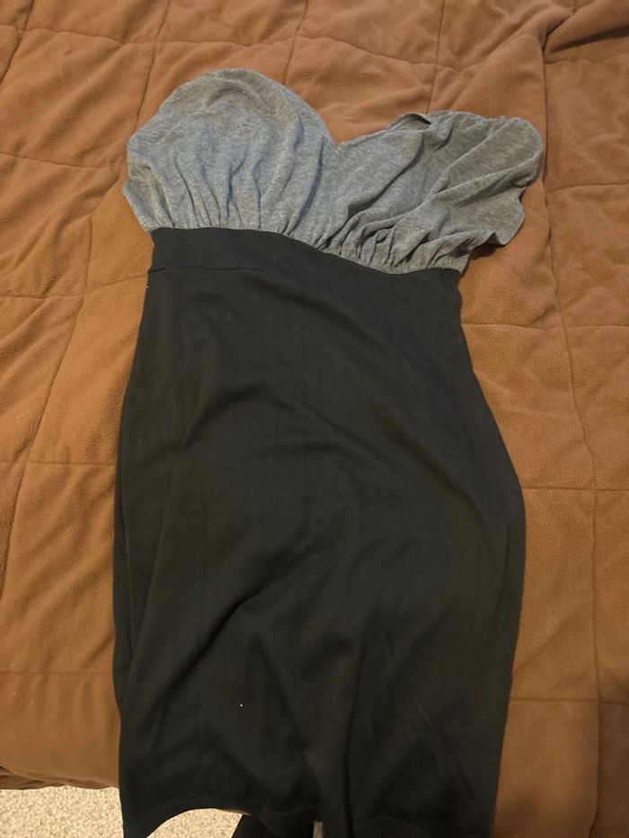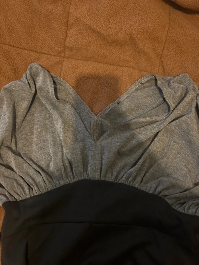 Grise en haut et après le bandeau intégré au niveau de dessous la poitrine, noire. Je ne me rappelle plus mais c’est une m ou l 😅 désolée plus d’étiquette. Elle s’arrête au niveau des genoux