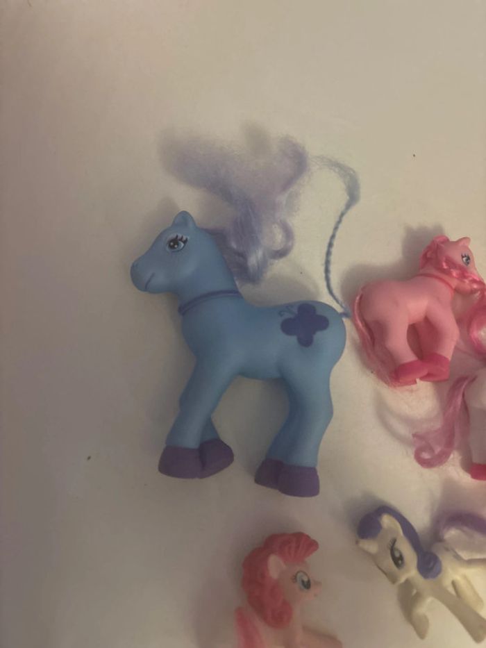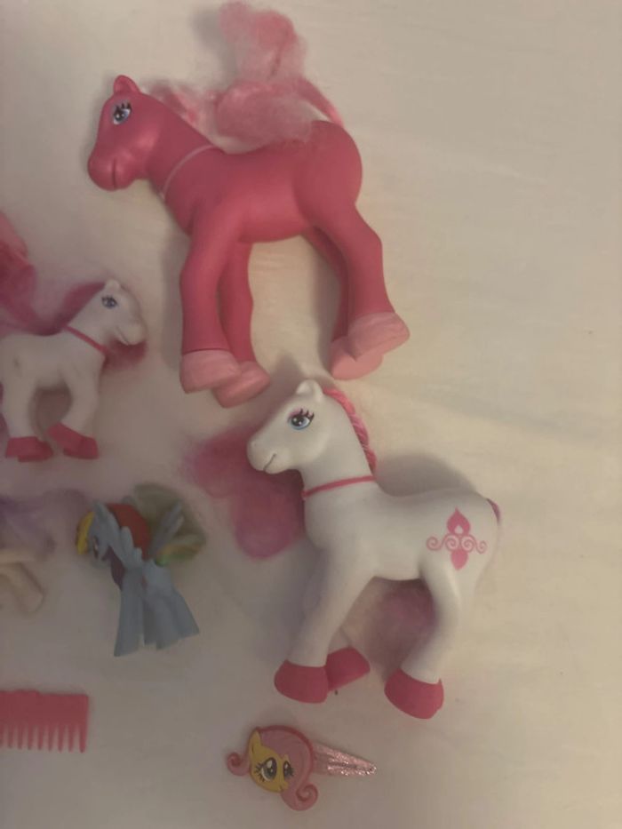Un lot de my little poney avec 3 grands, 2 moyens, 3 petits, un mini peigne pour les coiffer et une barrette à cheveux, juste deux petits défauts mais pas du tout dérangeant sur les deux petits poneys le blanc et le bleu (avant dernière et dernière photo)