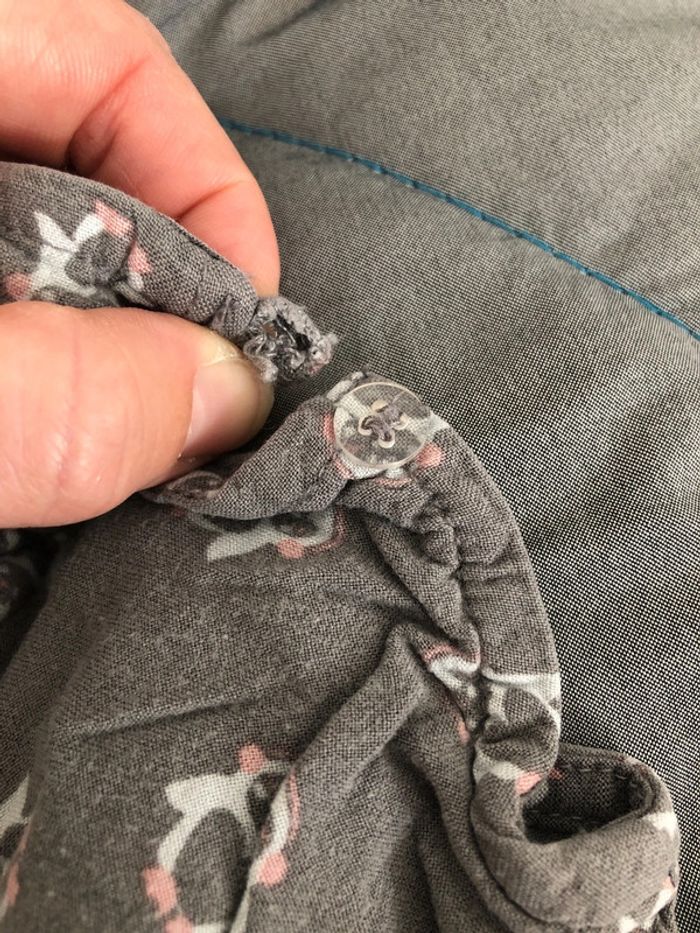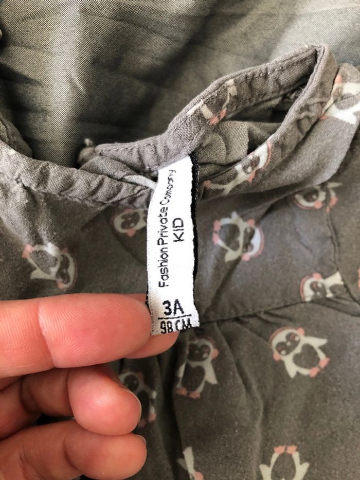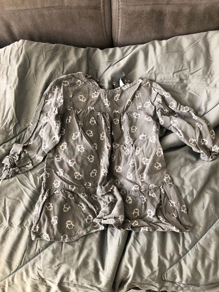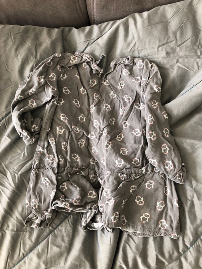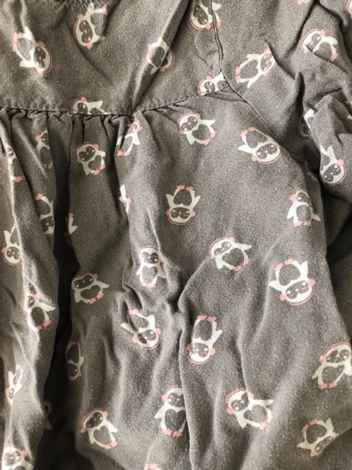 Motif pingouins et petit bouton dans le dos au niveau du col, sur la dernière photo, vous verrez que le petit trou dans lequel on met le bouton est un peu abîmé mais ne gêne en rien Manches 3/4 longues s’arrêtent au niveau dès avant bras