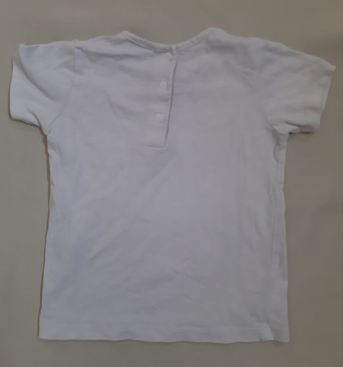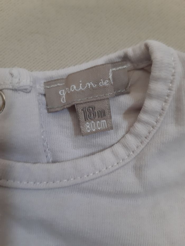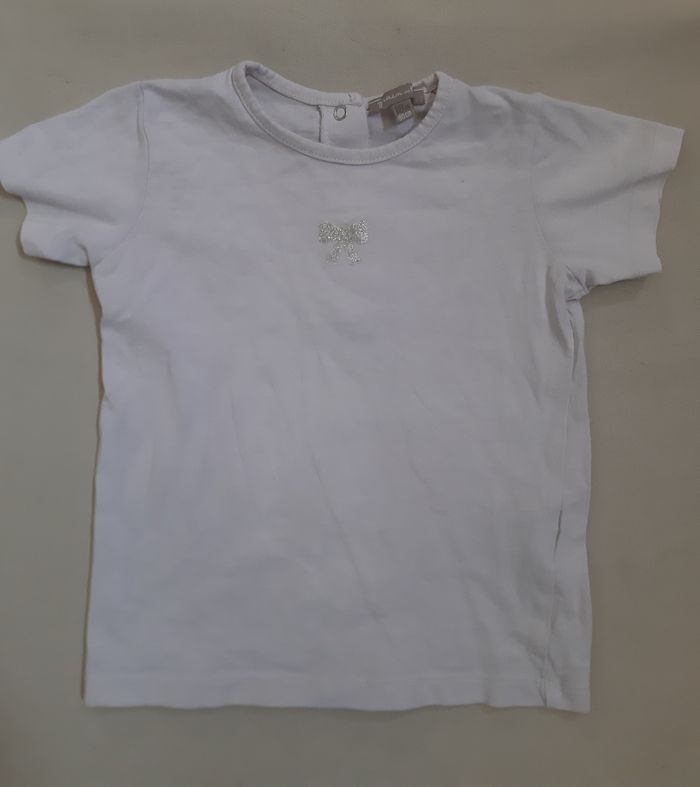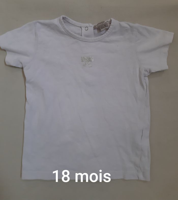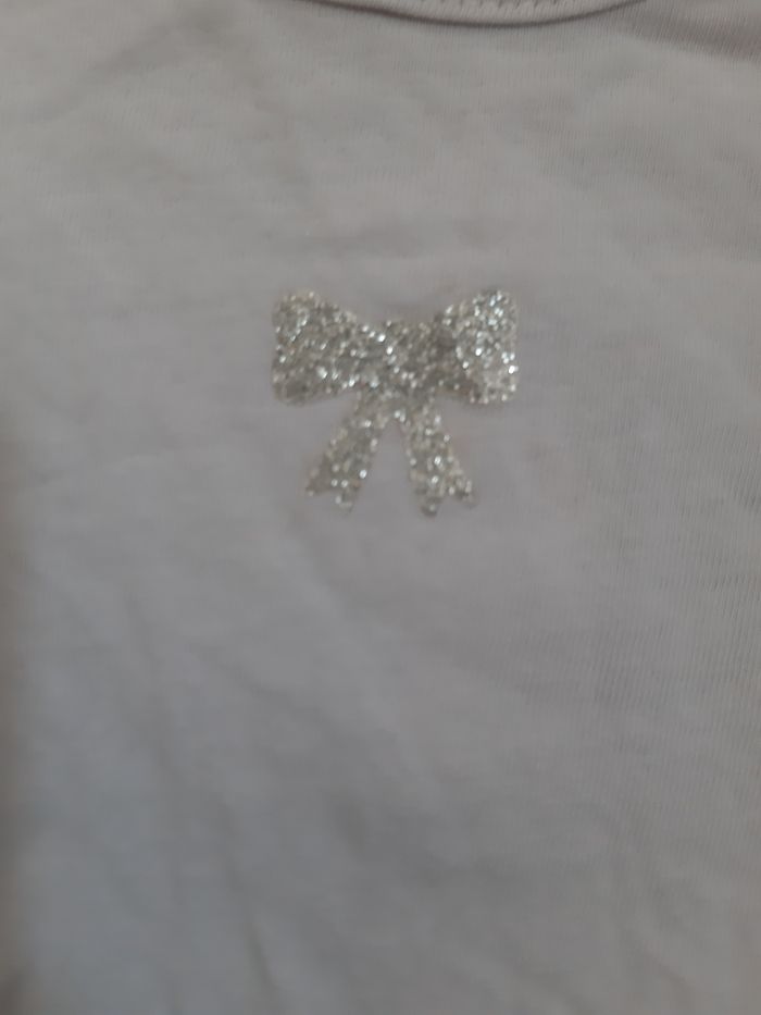 tee-shirt à manches courtes, de la marque grain de blé, en taille 18 mois couleur rose pâle motif : petit nœud argenté pailleté 3 boutons pressions dans le dos En très bon état.