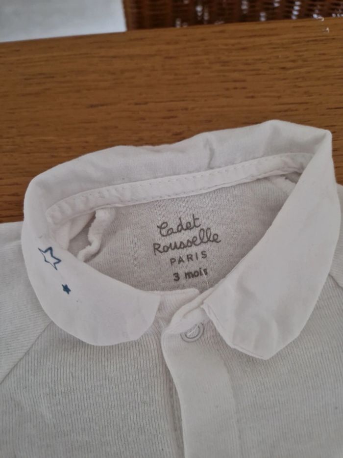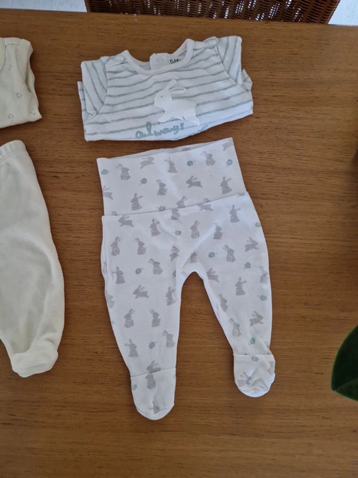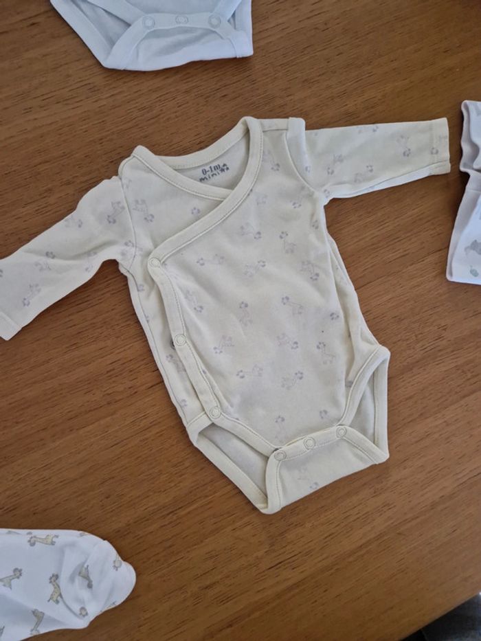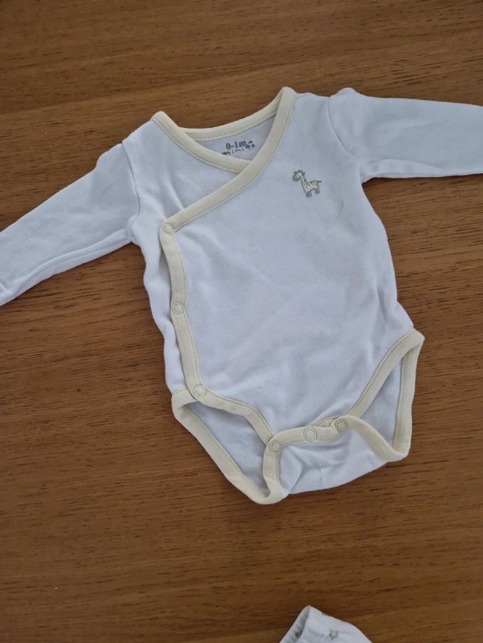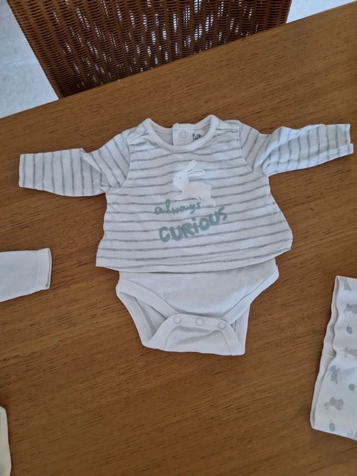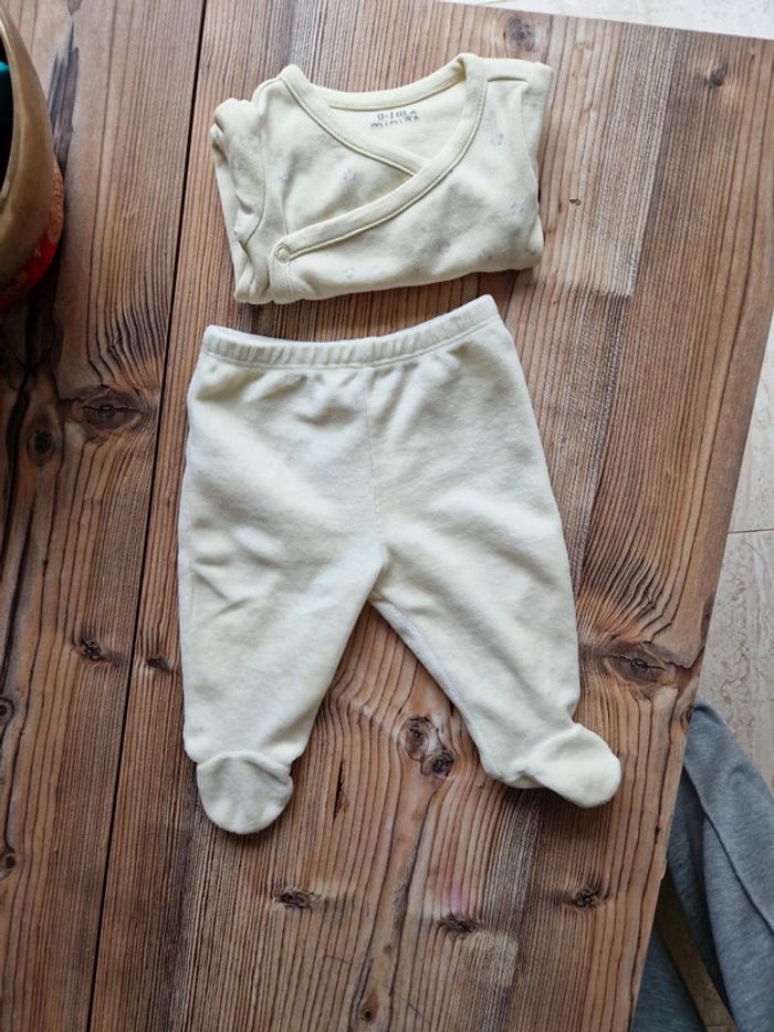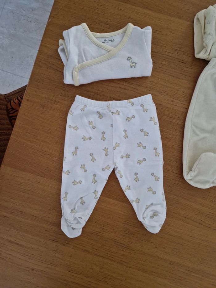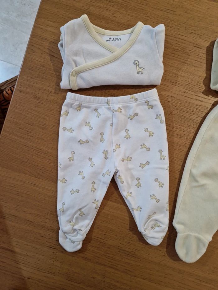 4 ensembles body + pantalon 0-1 mois 3 légers er 1 velour ( couleur jaune pâle) Peu porté Le body cadet rousselle c'est du 3 mois mais taille petit ( 1-2 mois)