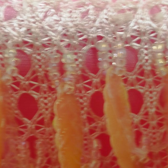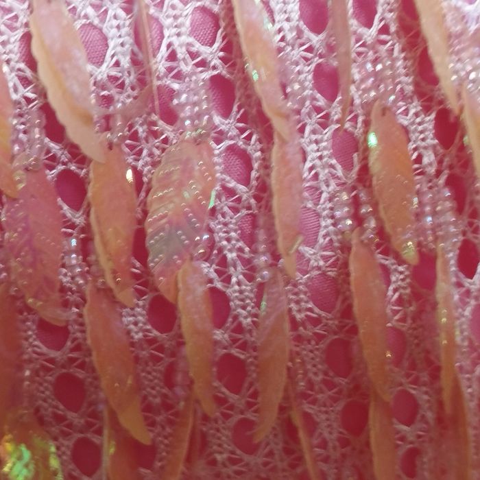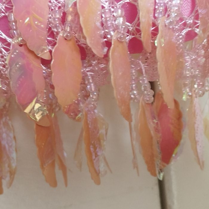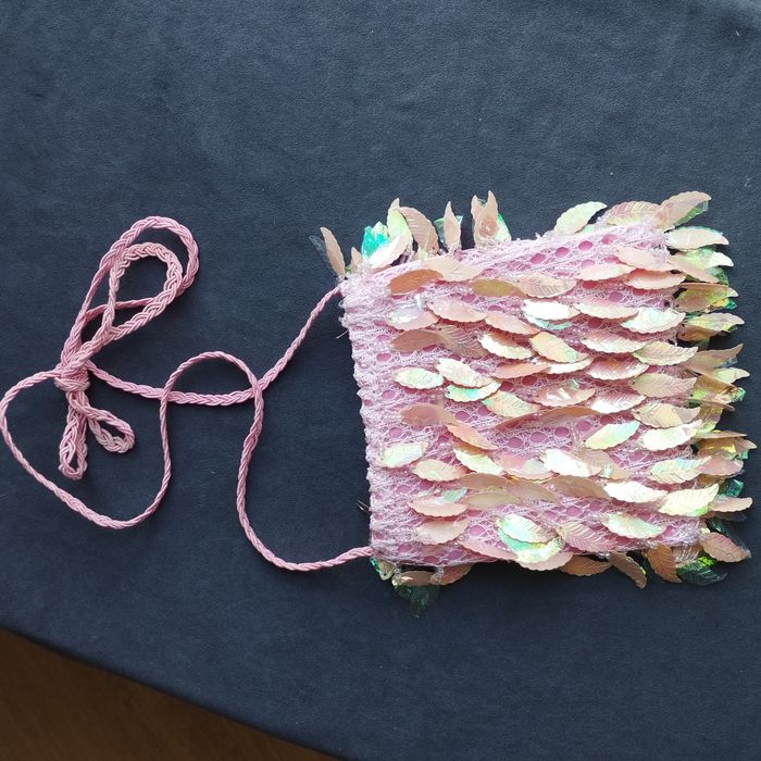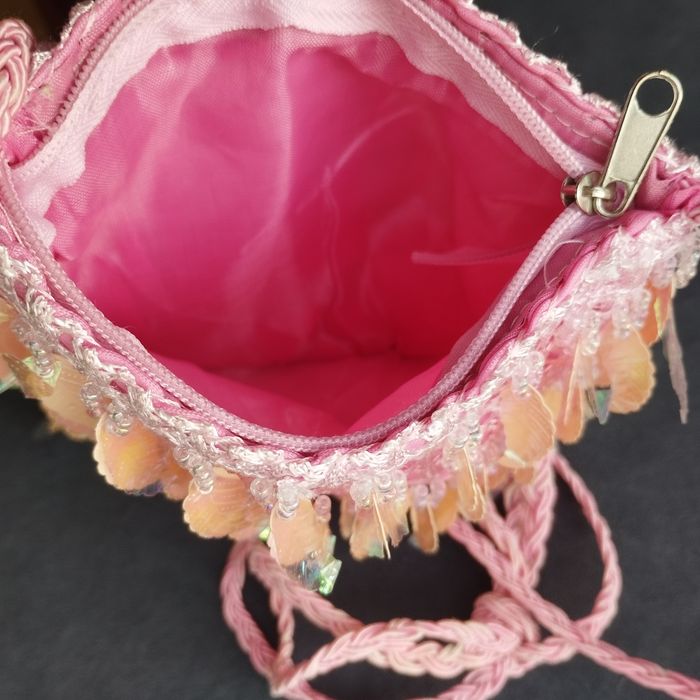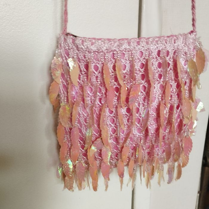 Petit sac bandoulière Rose, avec des perles et feuilles ou plumes plastifiées brillante, bandoulière fil coton tressé. Ouverture par fermeture éclair. 15cm/15cm.