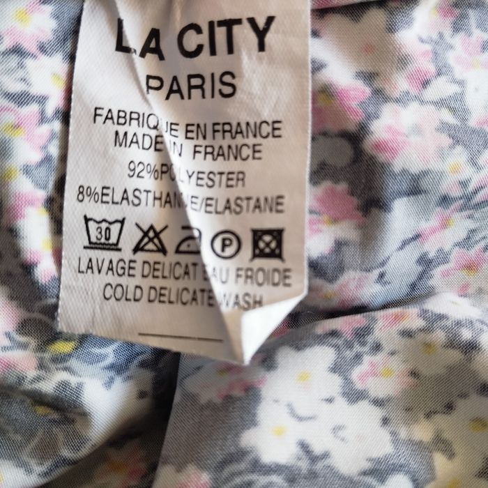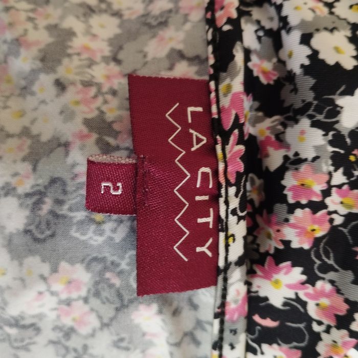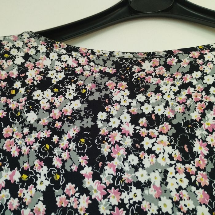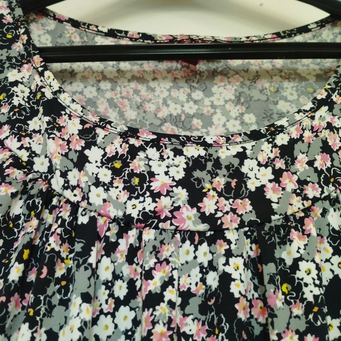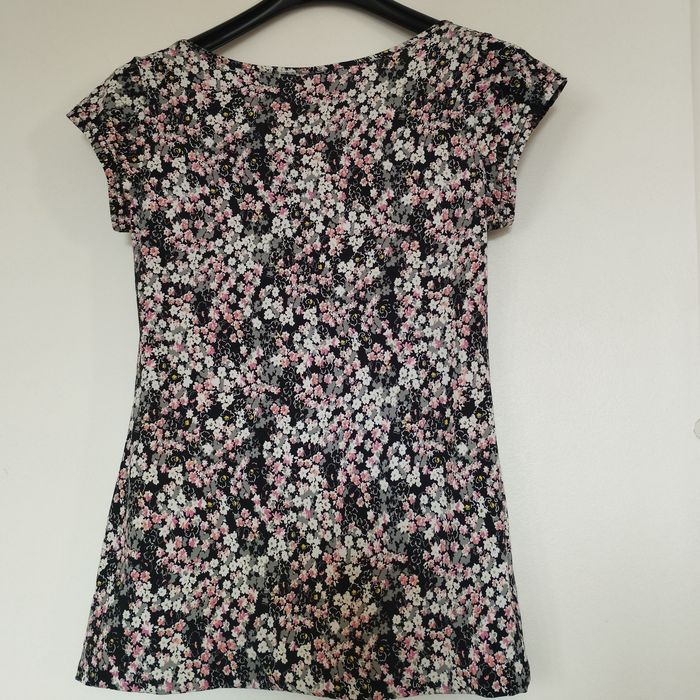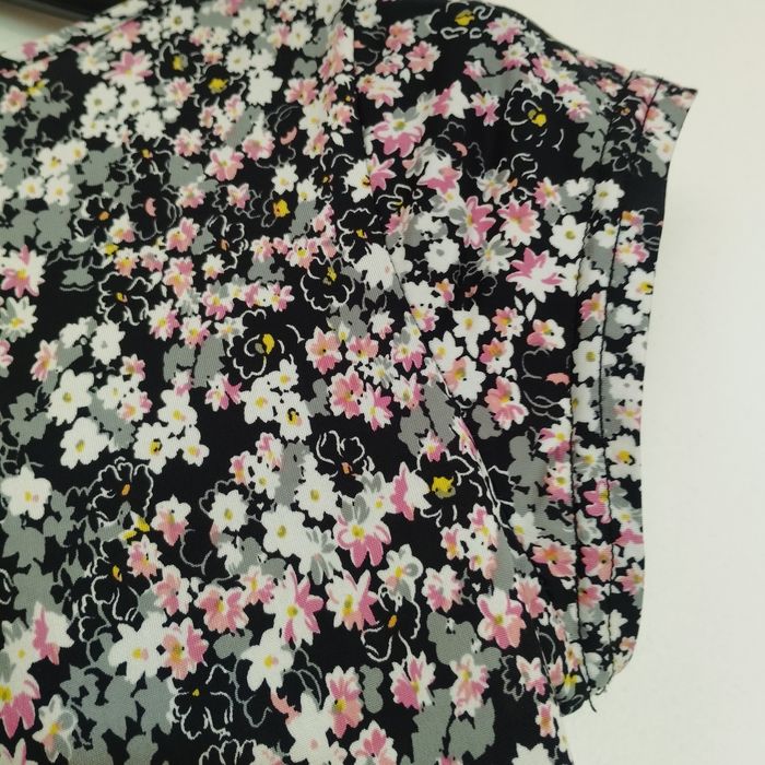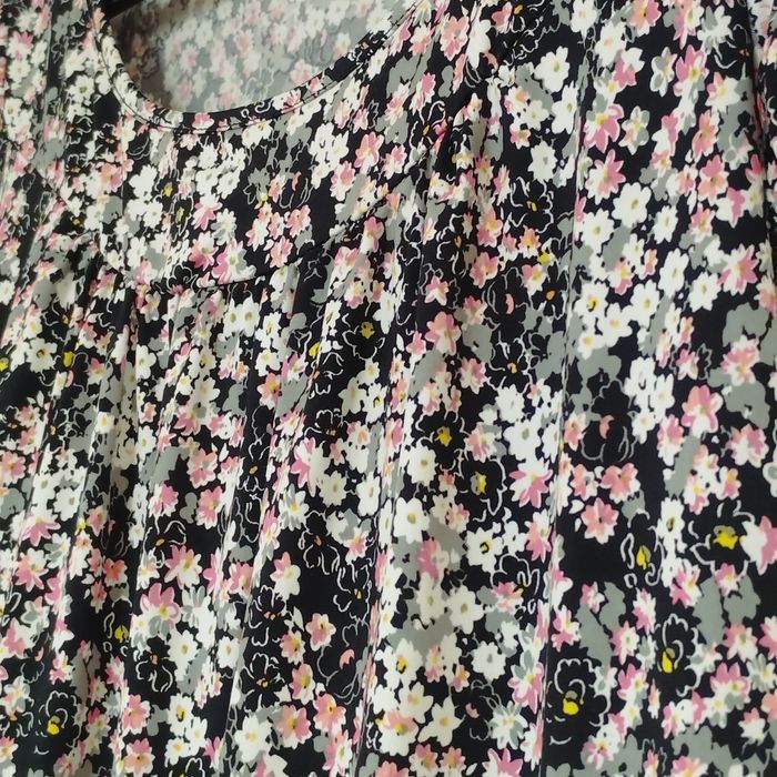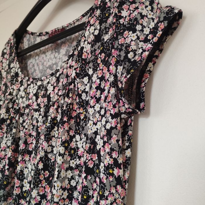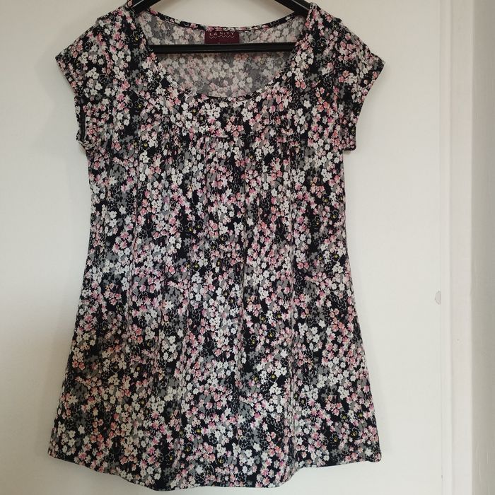 Haut fleurie pour femme Taille 2 de La City. Col arrondi et un peu de fronces au milieu. Petites manches, Couleurs fond noir et fleurs blanches, grises ,roses, et pointes de jaune. Aisselle à Aisselle 40cm.