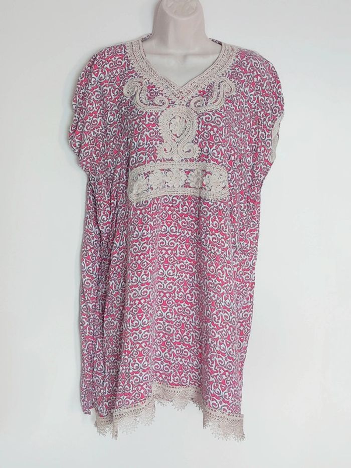 Tunique gandoura arabesque rose dentelle beige strass / Niêma - 36/S à 46/XXXL - photo numéro 1