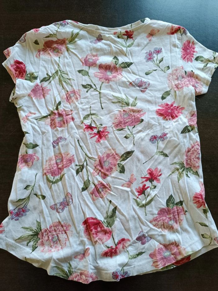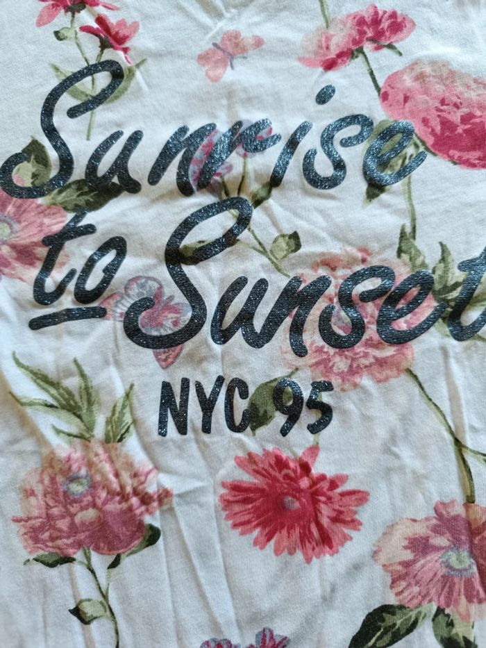 Tee shirt H&M Blanc Impressions florales Ecritures noires pailletées Manches courtes 100% Coton TAILLE 10/12 ANS TRES BON ETAT Allez voir mes autres ventes!
