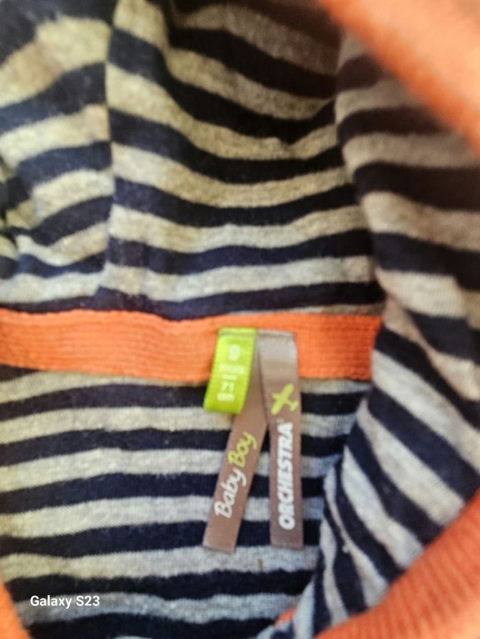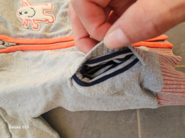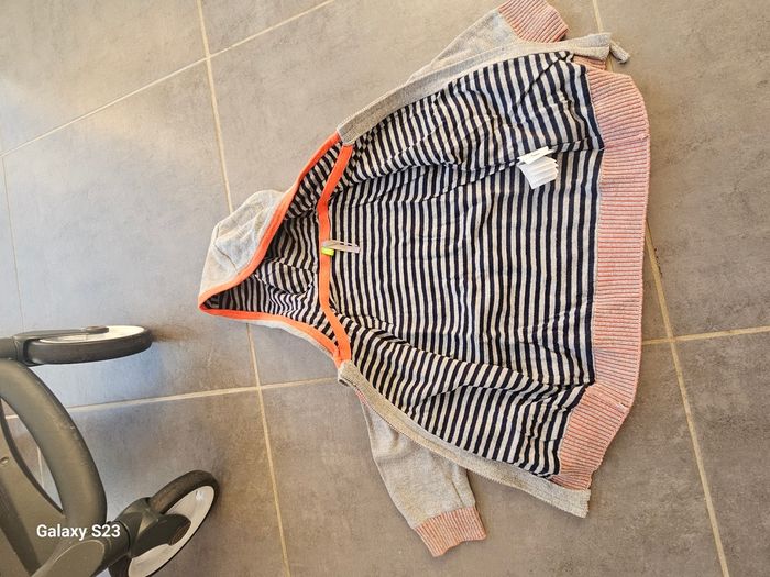 Veste zippée à capuche, avec une poche de chaque côté. Porté 2 fois par dessus une salopette, comme neuve Taille 9 mois