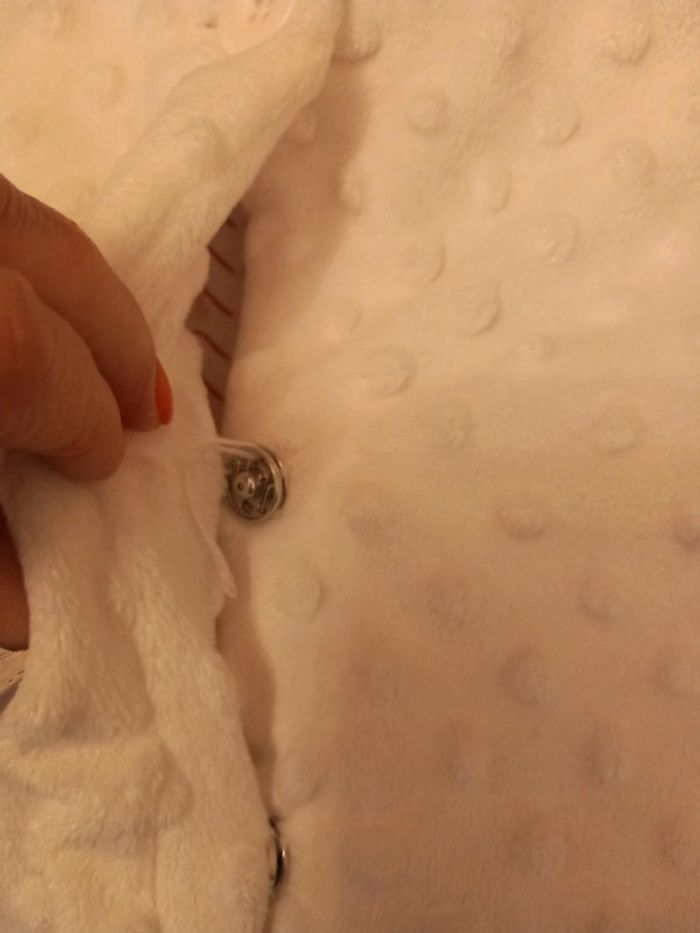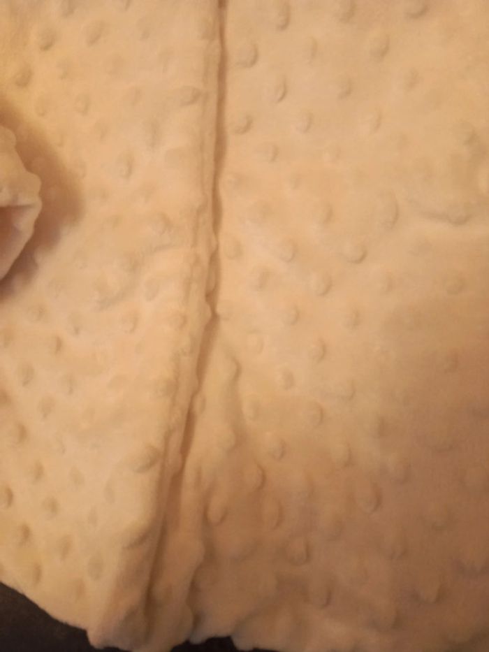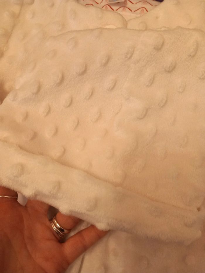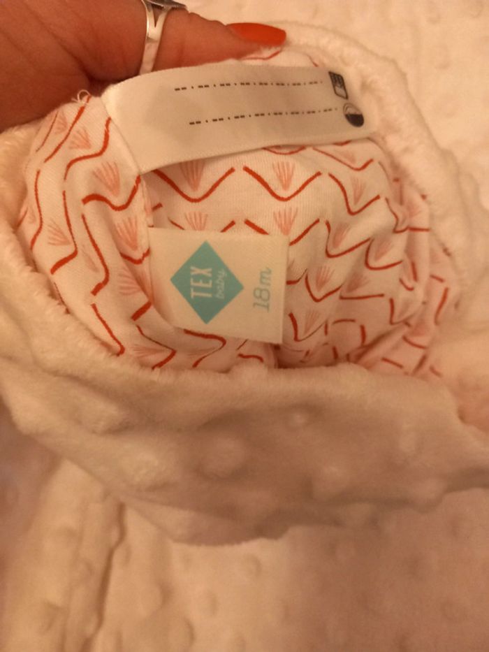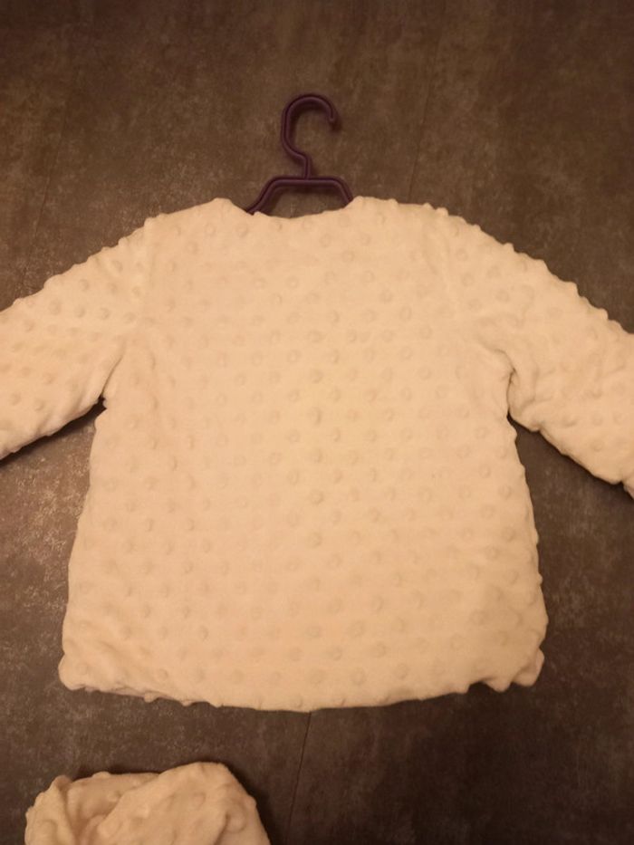 État neuf , bonnet jamais mis, manteau 1 fois pour une occasion, ni taches ni trous il a juste un petit point à faire sur une attache ( voir photos ) taille 18 mois . Blanc. Tex