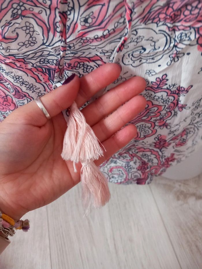 Très bon état. Taille M . Couleur dans les roses , gris et blanc . Pompons rose pâle