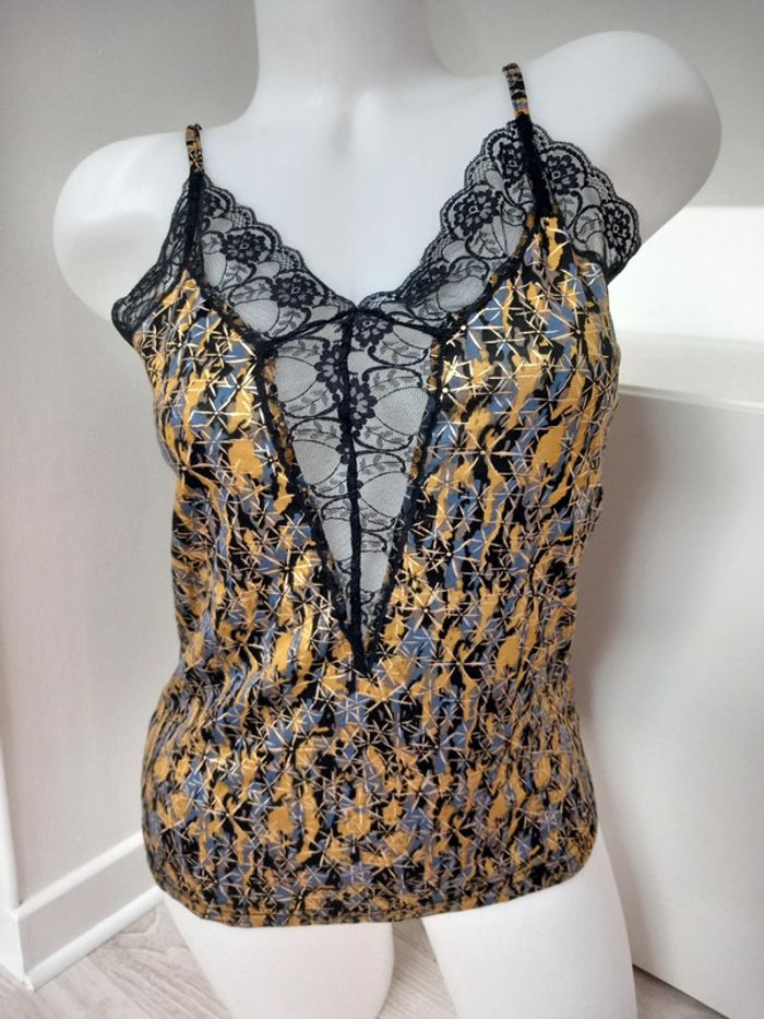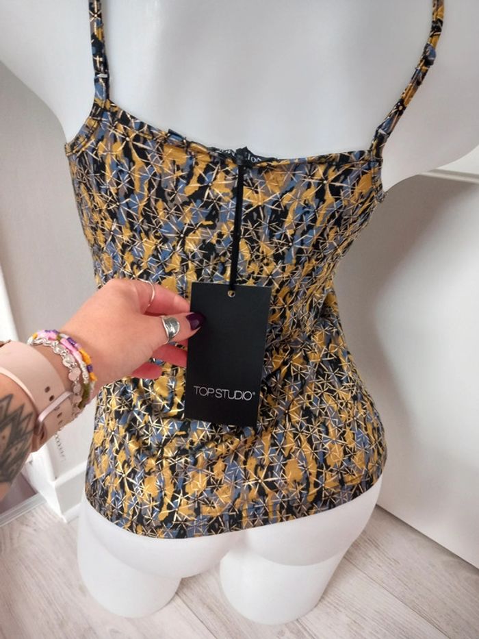 Neuf avec étiquette. Très classe et sexy . Bretelles réglables. Couleur noir,doré, moutarde,bleu . Taille 38/40 . Top studio