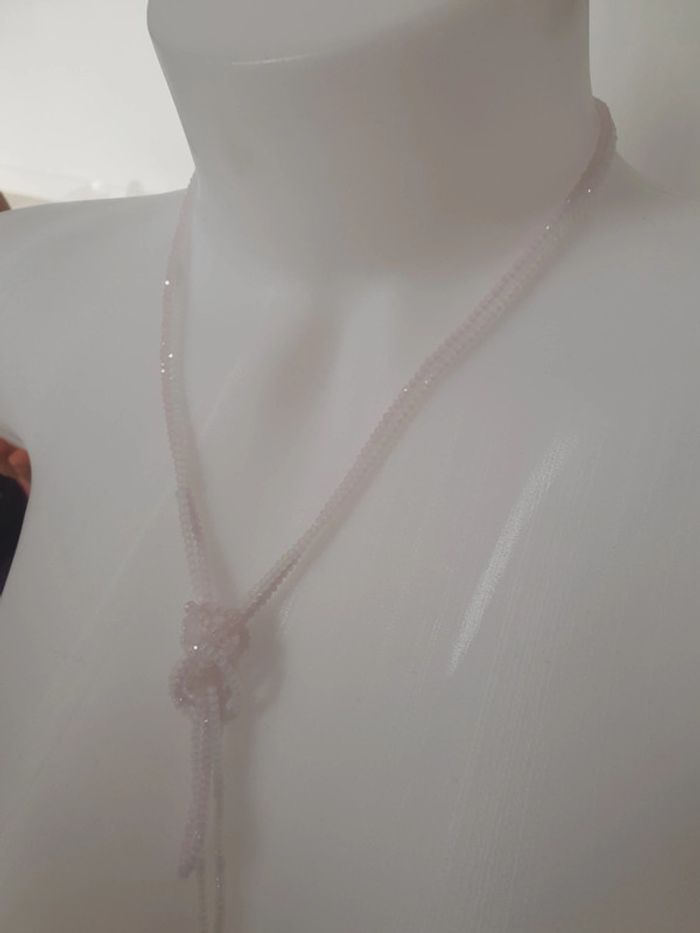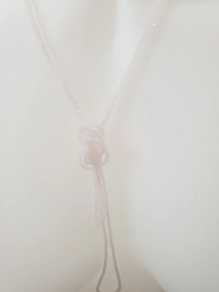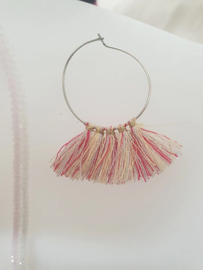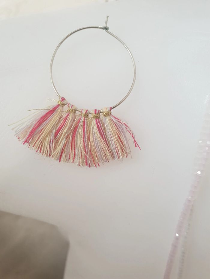 Très bon état, 1 paire de boucles d'oreilles, 2 colliers réglable à porter selon envie . Le tout dans les tons blanc , rose , beige