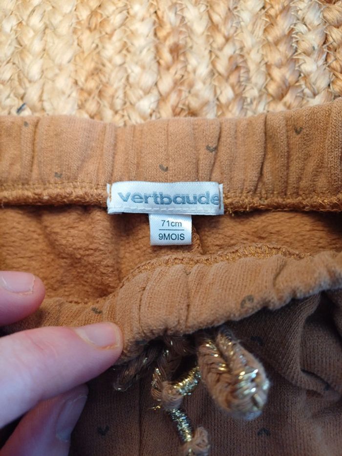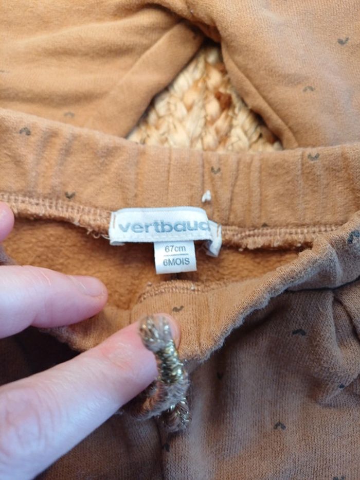 2 Pantalons identiques couleur camel verbaudet tout doux interieur chaud et confortable pour bébé taille 9mois. Lacet doré poches volants . 1 Neuf juste lavé 9 mois 1 en très bon état 6 mois.