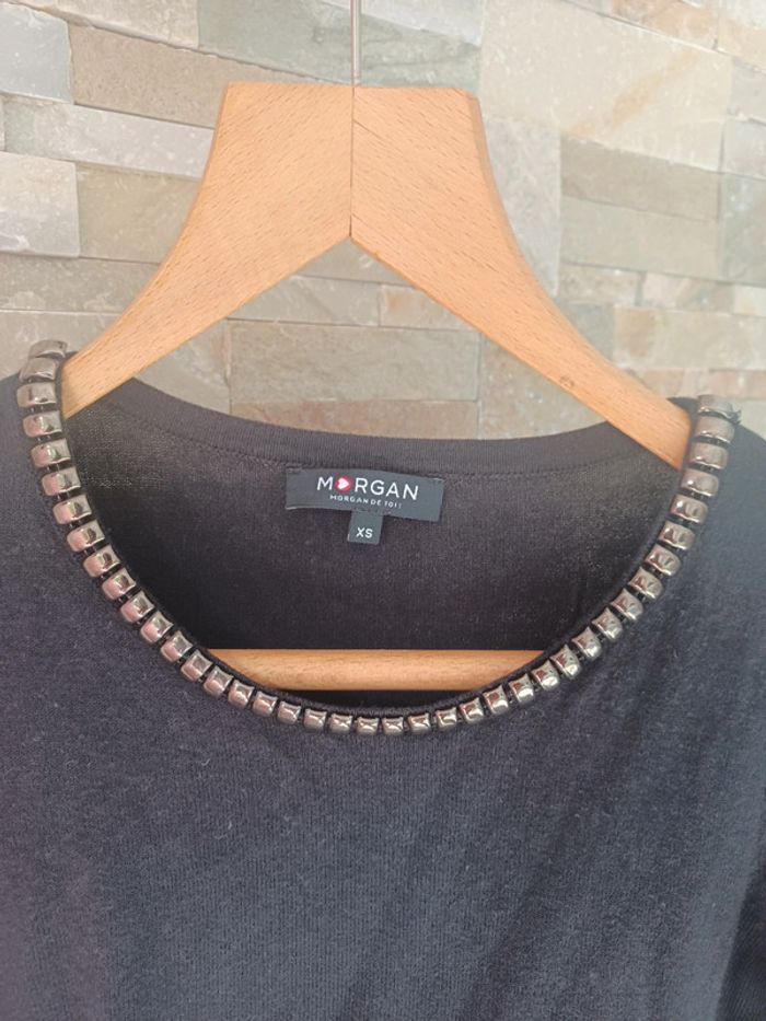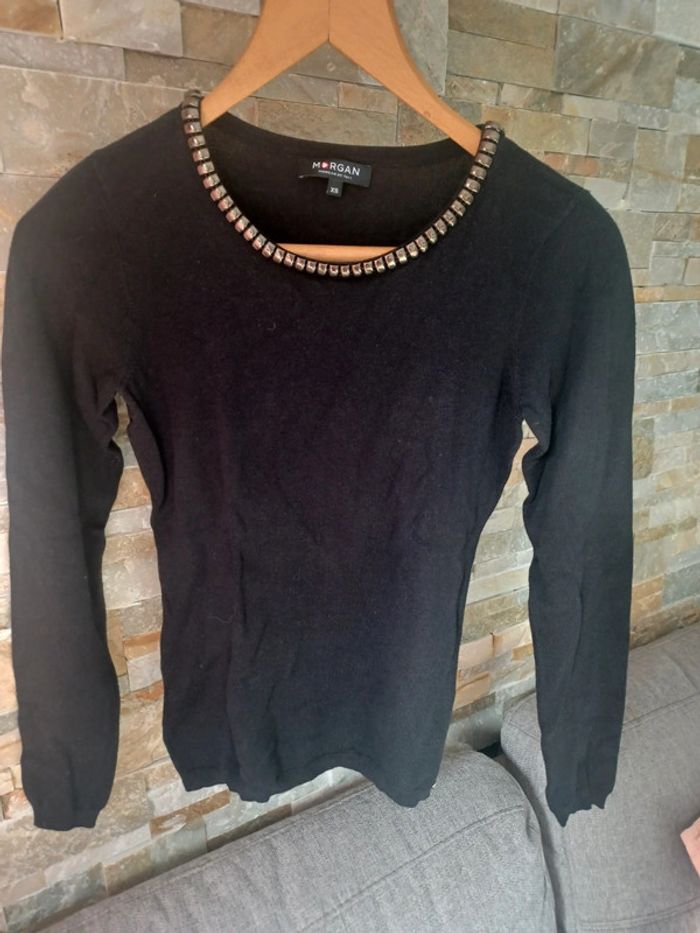 Pull morgan noir encolure ronde avec bijoux argenté taille xs porte 2 fois. Taille xs.
