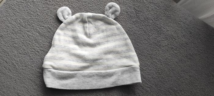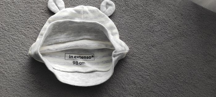 Bonnet In Extenso gris clair et blanc à rayures avec 2 mini oreilles. Taille 98 cm, en coton, en excellent état. Envoi rapide.