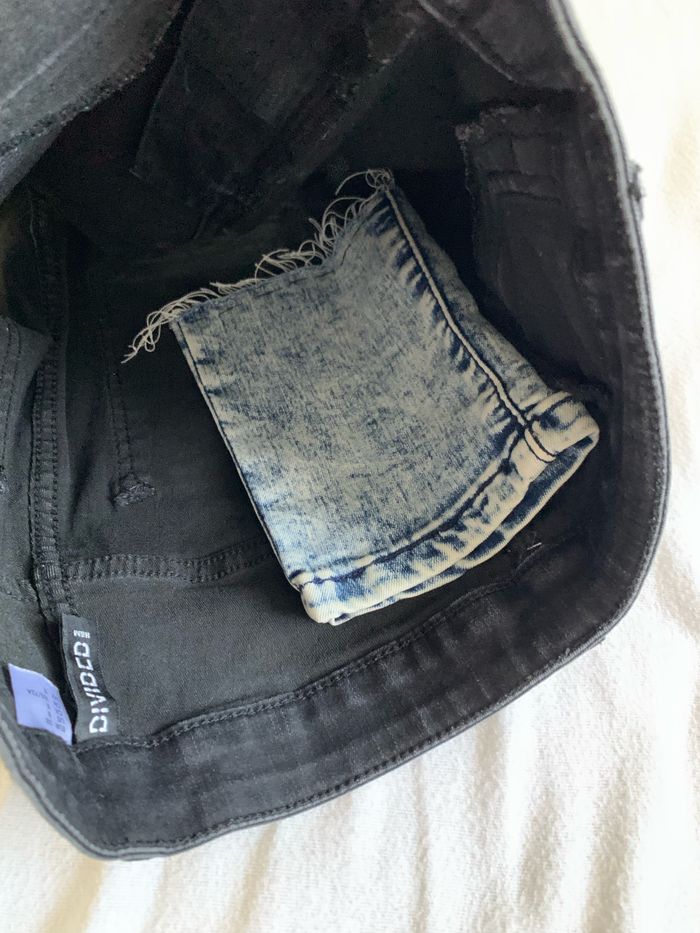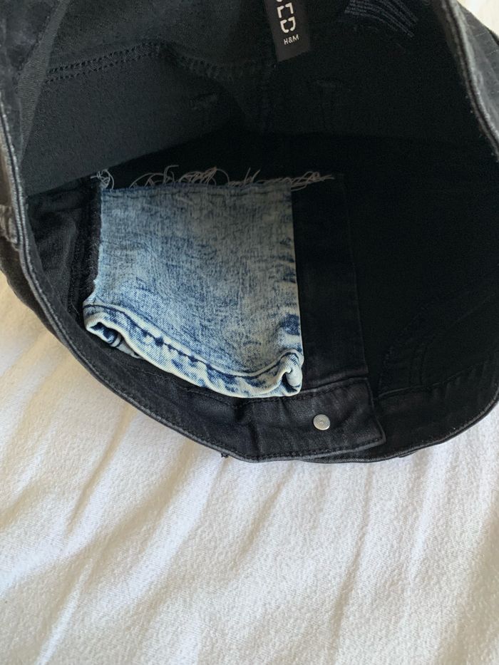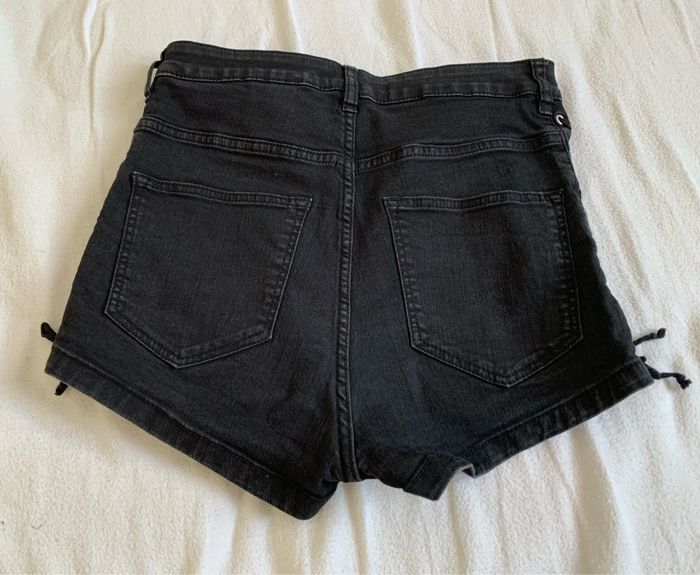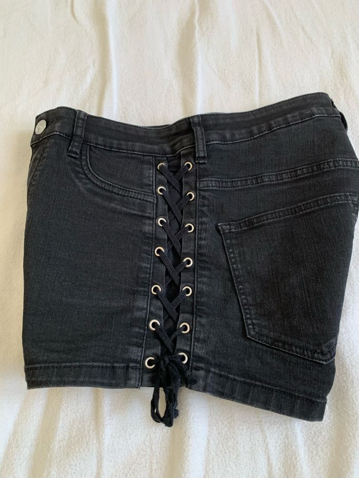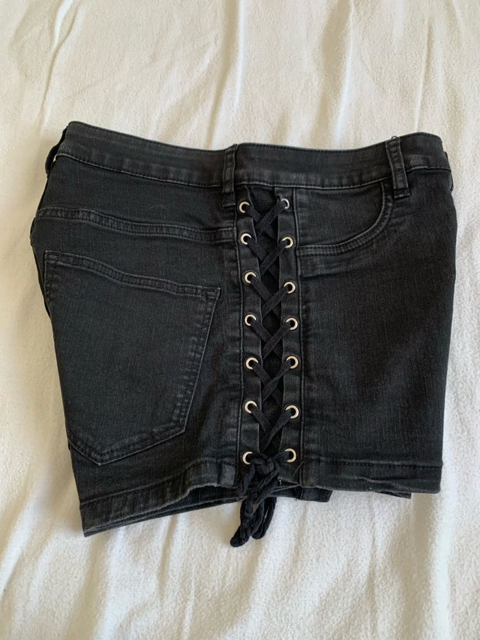 Short noir court avec de lacets sur les côtés, une poche a été rajouté à l'intérieur pour y mettre des clés ou un portable ou un portefeuille ou autre, la poche peut se découdre sans abimé le short, taille 38 de chez H&M, 74% coton, 24%polyester, 2% élasthanne