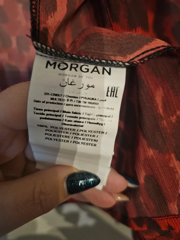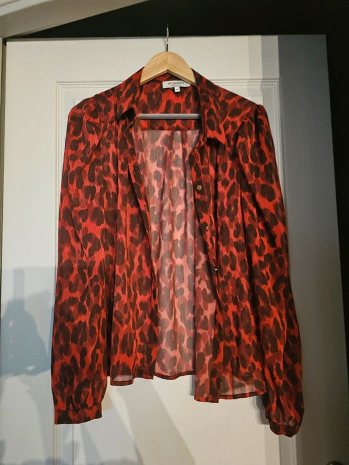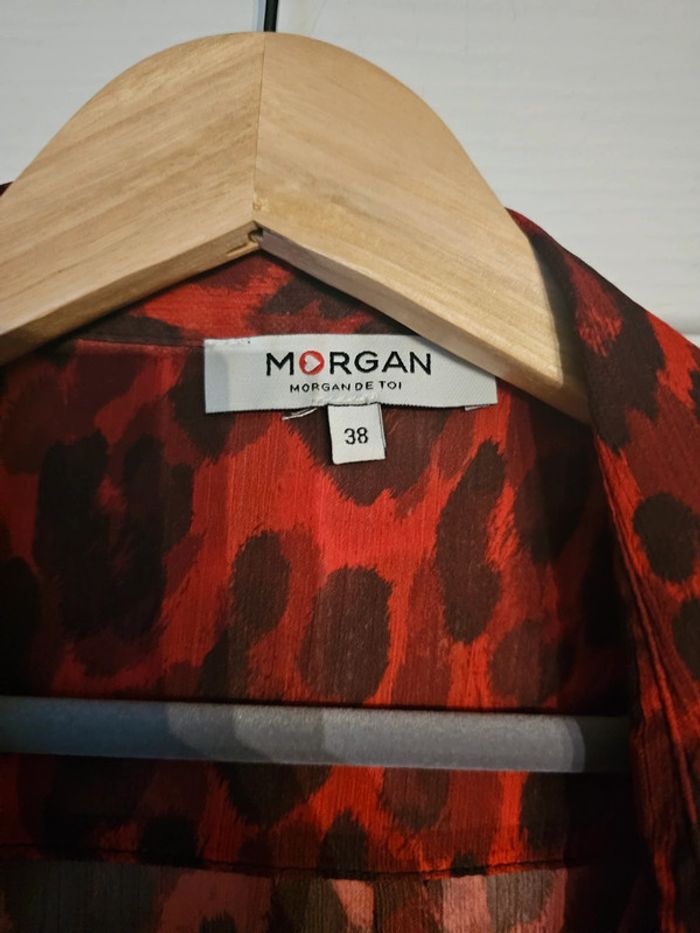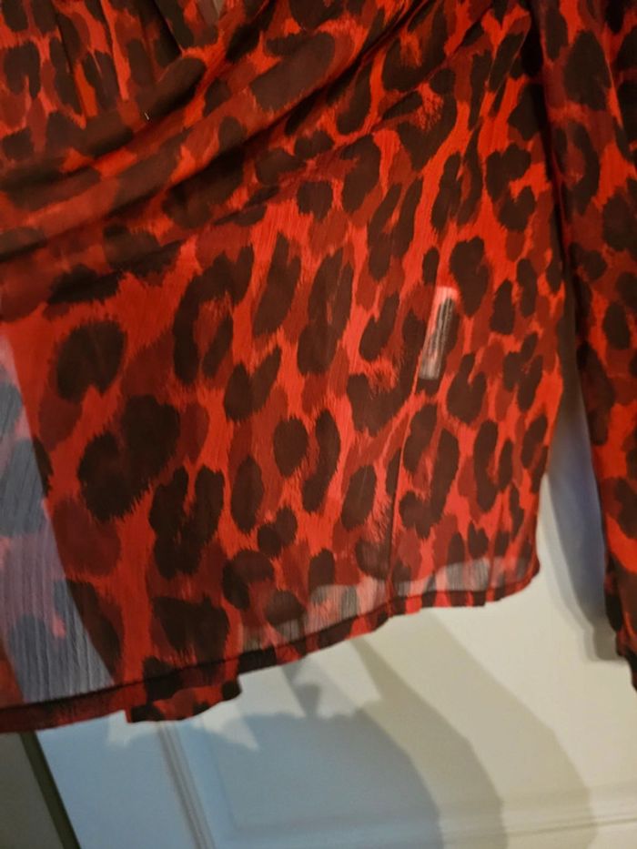 Blouse Morgan léopard rouge et noir Fine et transparente Jamais portée La taille ne me convient pas : achetée sur internet Taille 38 Peut se porter ouverte ou fermée