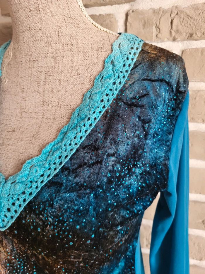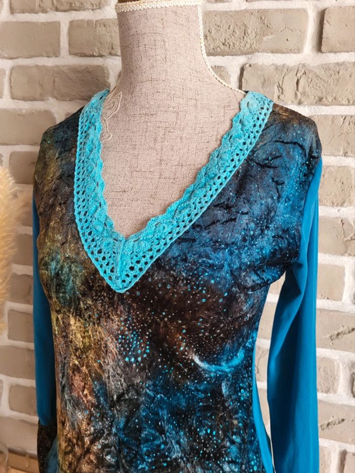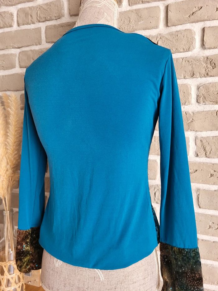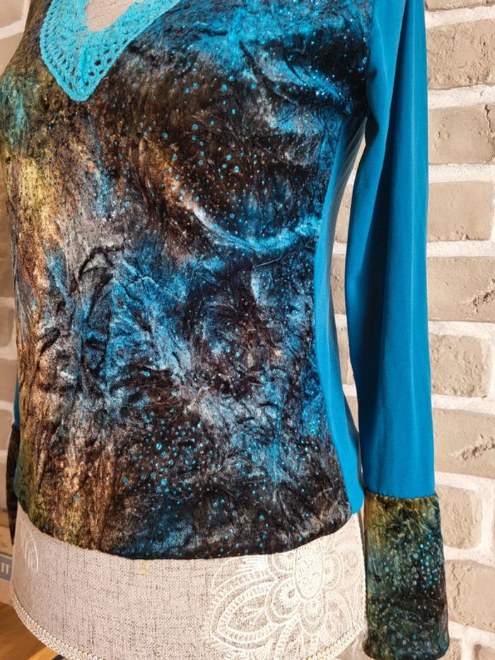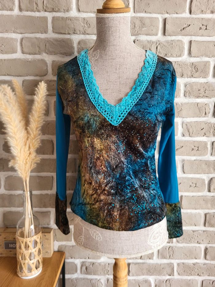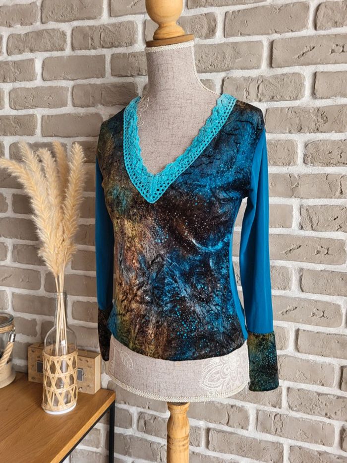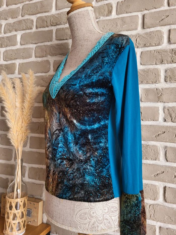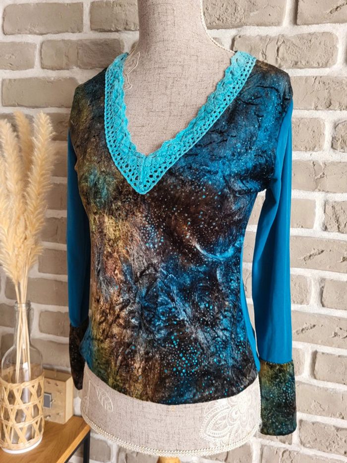 💝 Bénéficiez d'une réduction en créant lot dans mon dressing 🛍️ 🌸 T-shirt à manches longues Vintage, en bon état, sans défaut à signaler 🎀 Un joli mix de matière : velours sur le devant et aux poignets parsemé de strass, tissu fluide dans le dos et aux manches, maille crochet au col Imprimé artistique et original dans des tons de bleu, de turquoise, de marron et de mordoré évoquant une ambiance nature ou galactique 🪷 Col en V Base élastiquée 🍥 Taille S 36 🩷 Quelques idées de look : - avec un jean flare pour un style bohème - avec une jupe longue fluide pour une touche folk romantique - avec un pantalon slim et un blazer pour une jolie silhouette