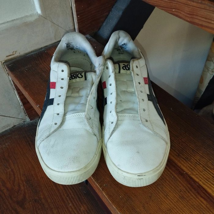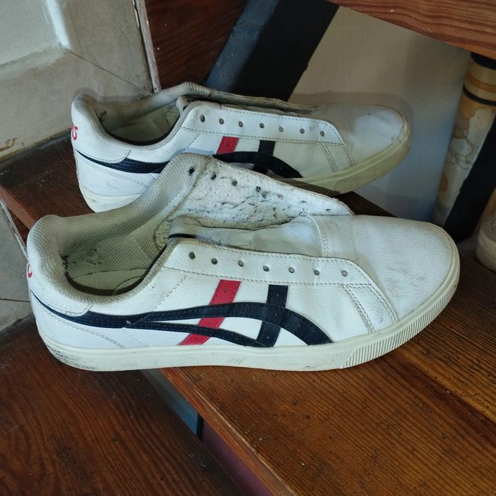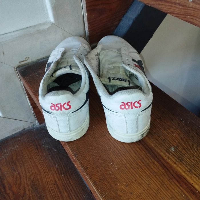 Baskets Asics homme taille 42 cuir blanche avec motif rayé de couleur Bon état porté normalement (visiter mon site les prix sont abordables et négociable)
